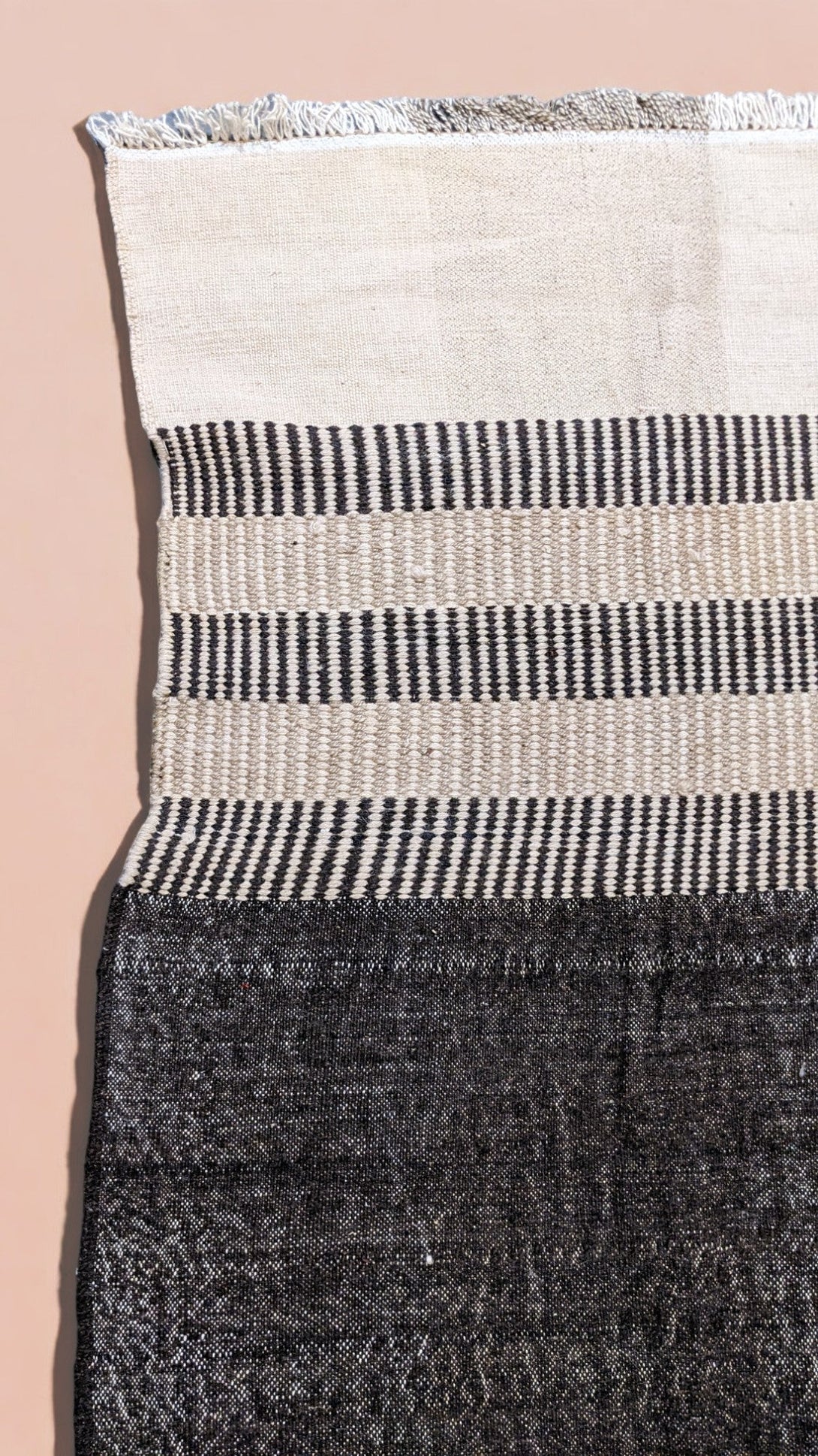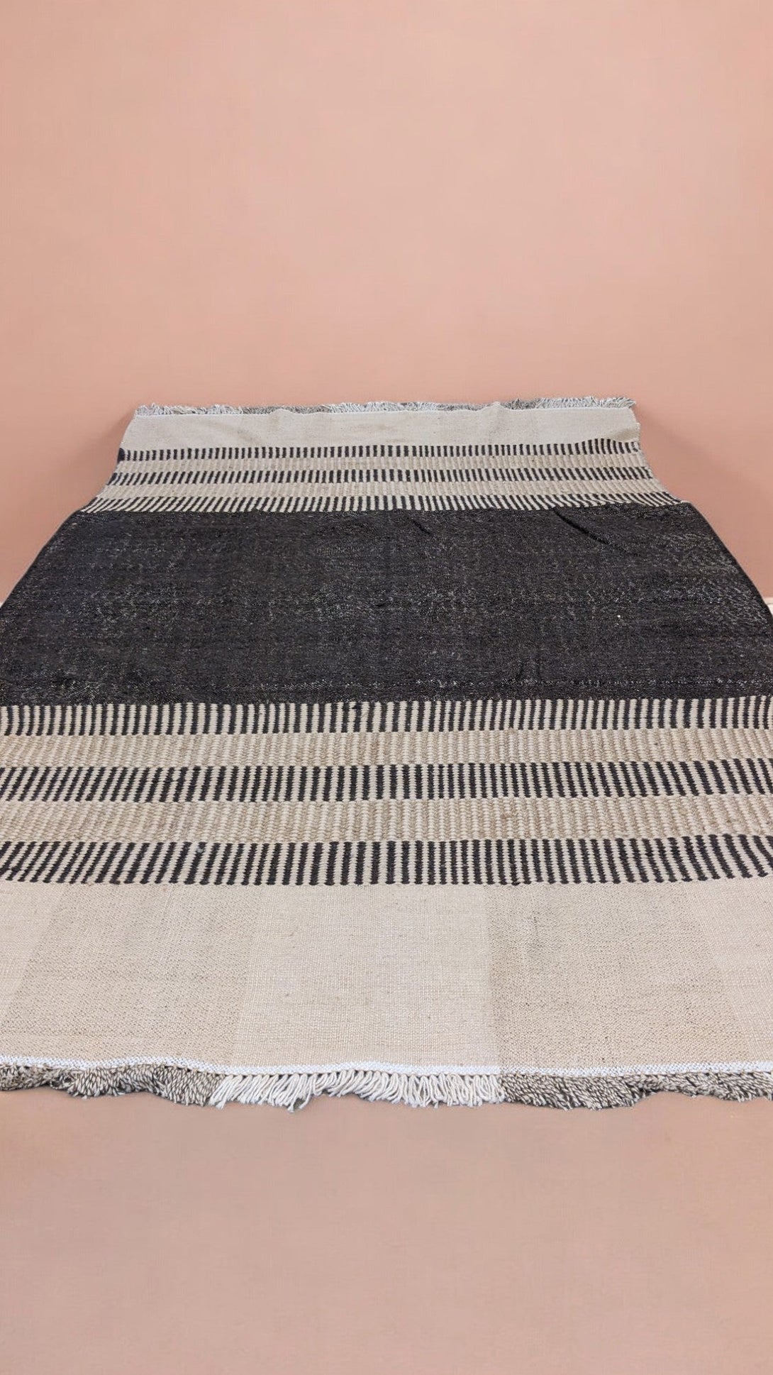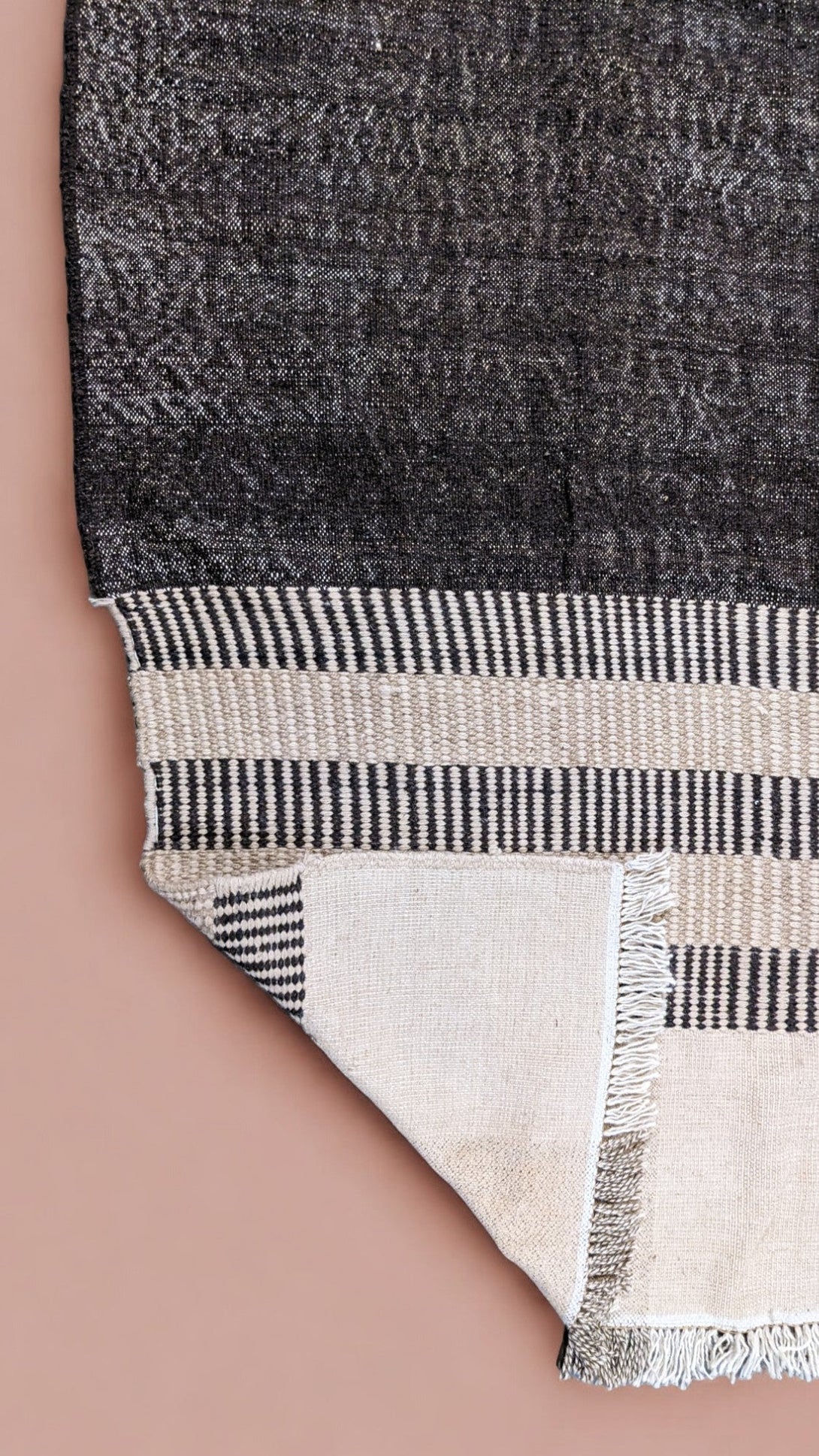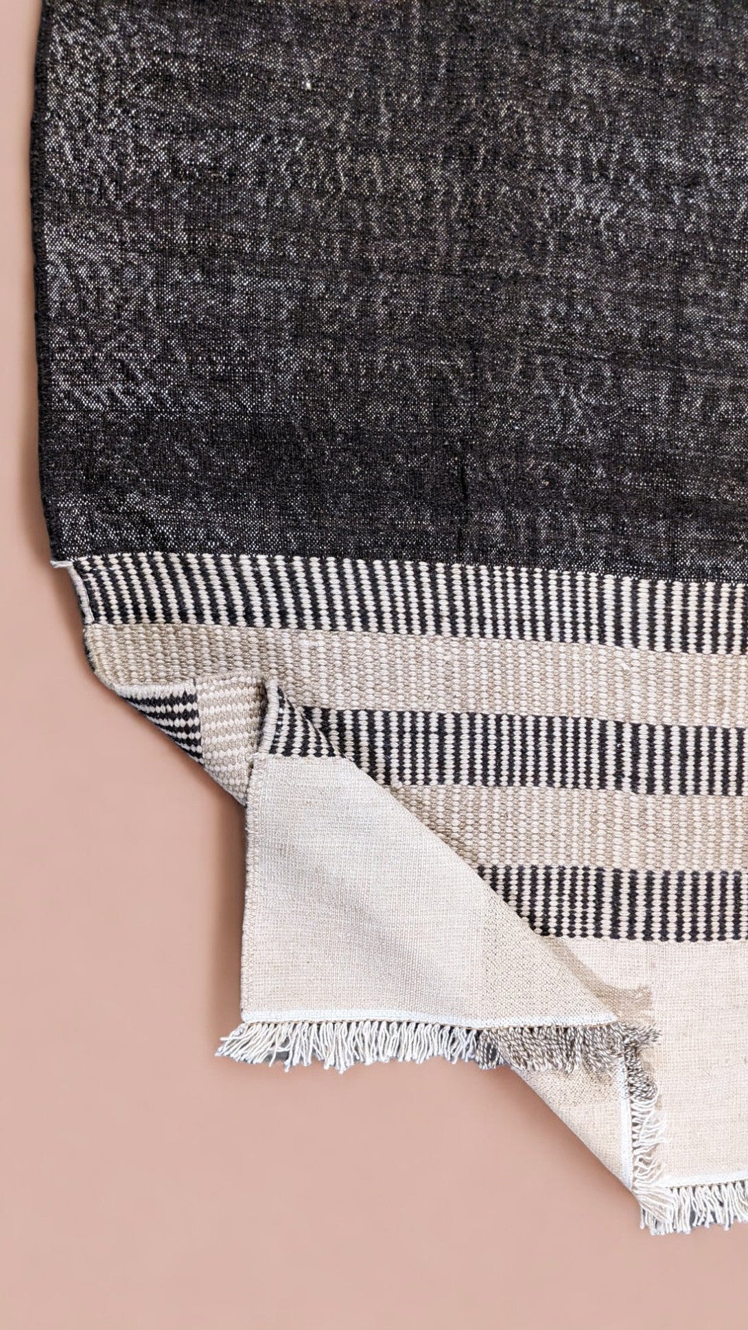 Ground breaking flat-weave rug, Elara, blends innovative design with age-old skill. A textured masterpiece is produced by gradient effects, vivid colours, and vertical borders. Classy and scorching the deep brown colour of this valuable wool piece promotes creativity and longevity in any interior setting.