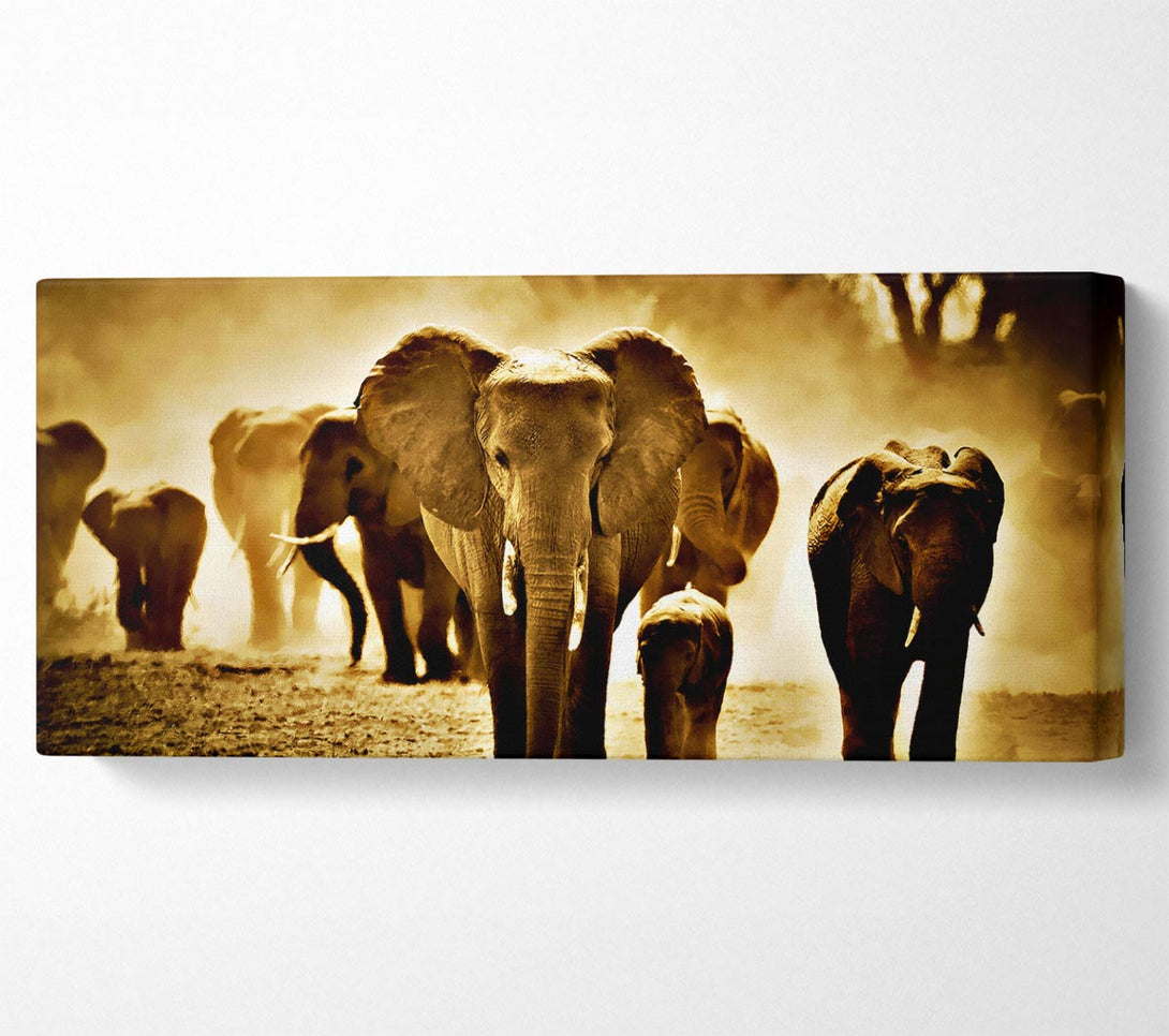 Elephant Stampede canvas, printed on coated polyester canvas. Mounted on to a 44mm box frame, ready to hang.