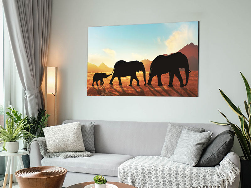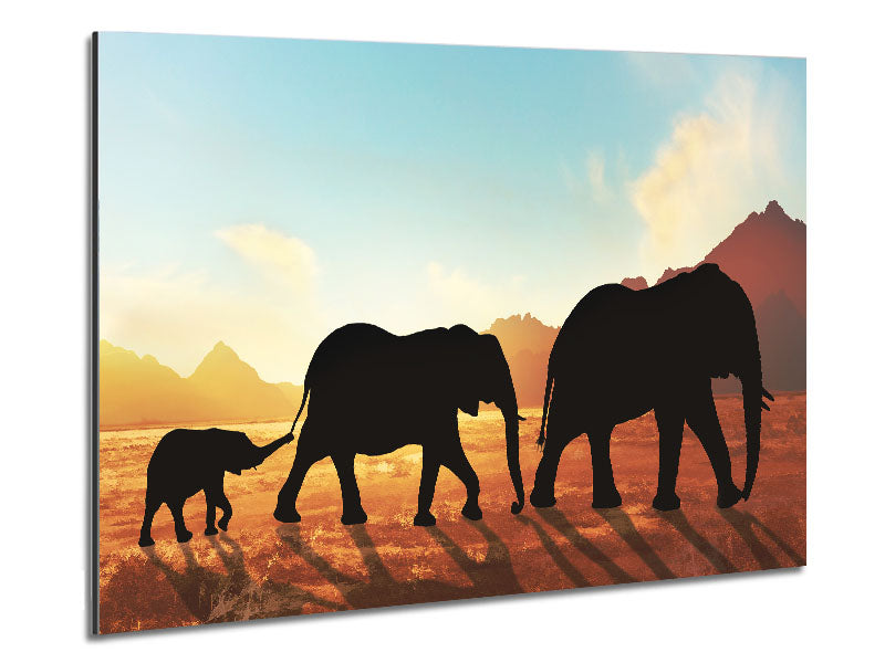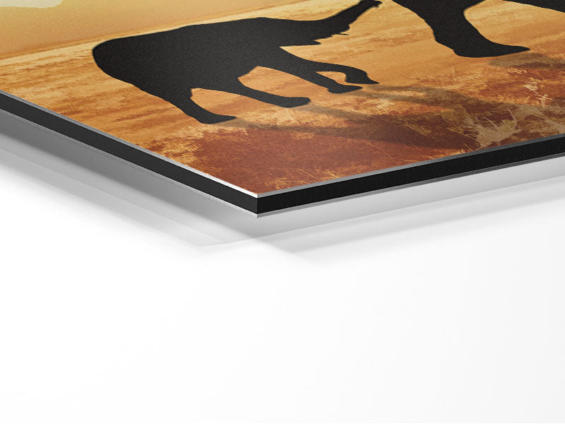 Elephants sillouette walking Printed on brushed aluminium dibond. A modern way to display art and easy to maintain.
