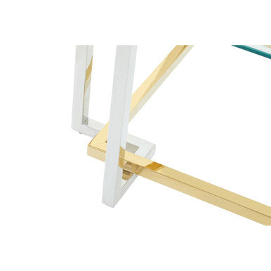 Ideal for keeping essentials close at hand, this glass coffee table looks perfect in the living room and hallway. This coffee table lends a contemporary accent with a clear tempered glass top. The stainless steel frame has an intersecting base in a silver and gold finish that showcases a geometric appeal and creates an art deco allure.