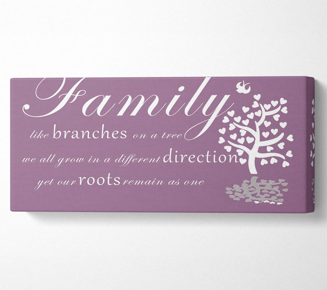 Family Quote Family Like Branches On A Tree Dusty Pink canvas, printed on coated polyester canvas. Mounted on to a 44mm box frame, ready to hang.