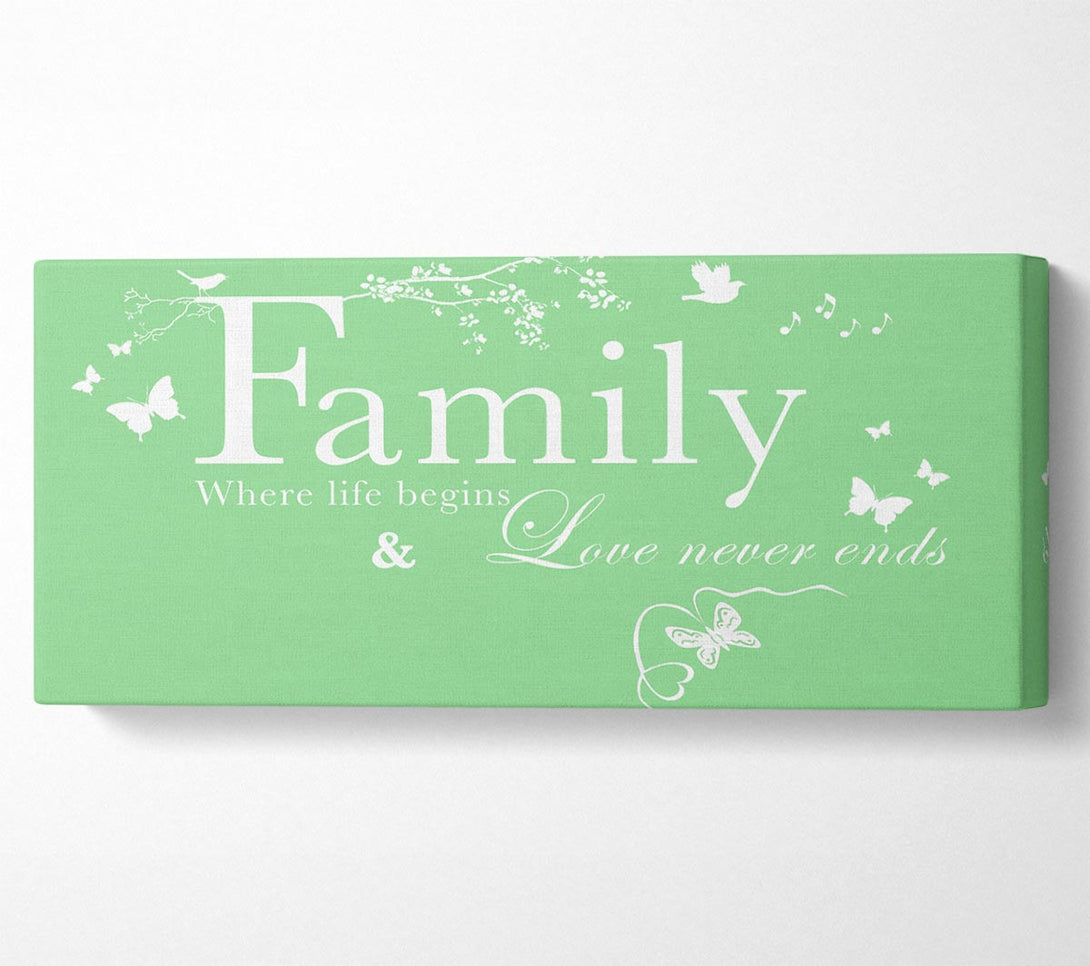 Family Quote Family Where Life Begins Green canvas, printed on coated polyester canvas. Mounted on to a 44mm box frame, ready to hang.