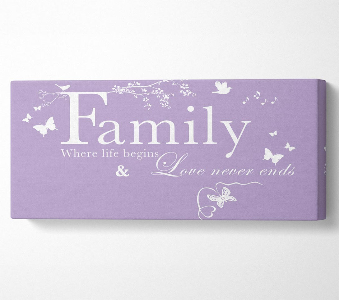 Family Quote Family Where Life Begins Lilac canvas, printed on coated polyester canvas. Mounted on to a 44mm box frame, ready to hang.