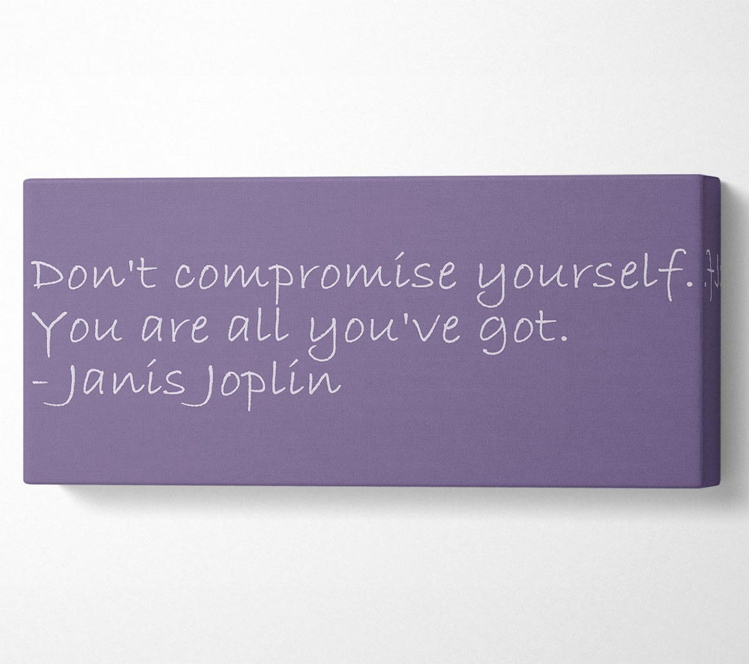 Famous Quote Janis Joplin Dont Compromise Yourself Lilac canvas, printed on coated polyester canvas. Mounted on to a 44mm box frame, ready to hang.