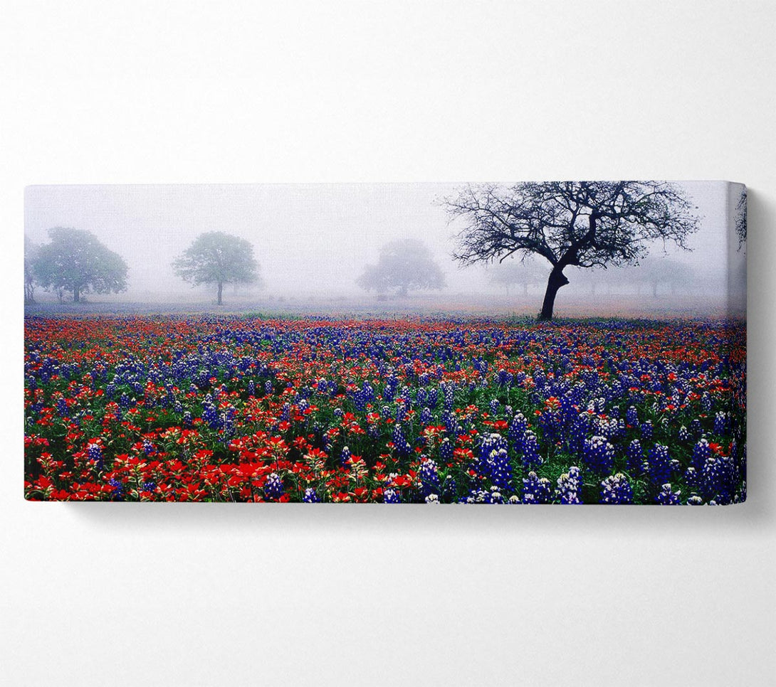 Field Of Flowers In The Morning Mist canvas, printed on coated polyester canvas. Mounted on to a 44mm box frame, ready to hang.