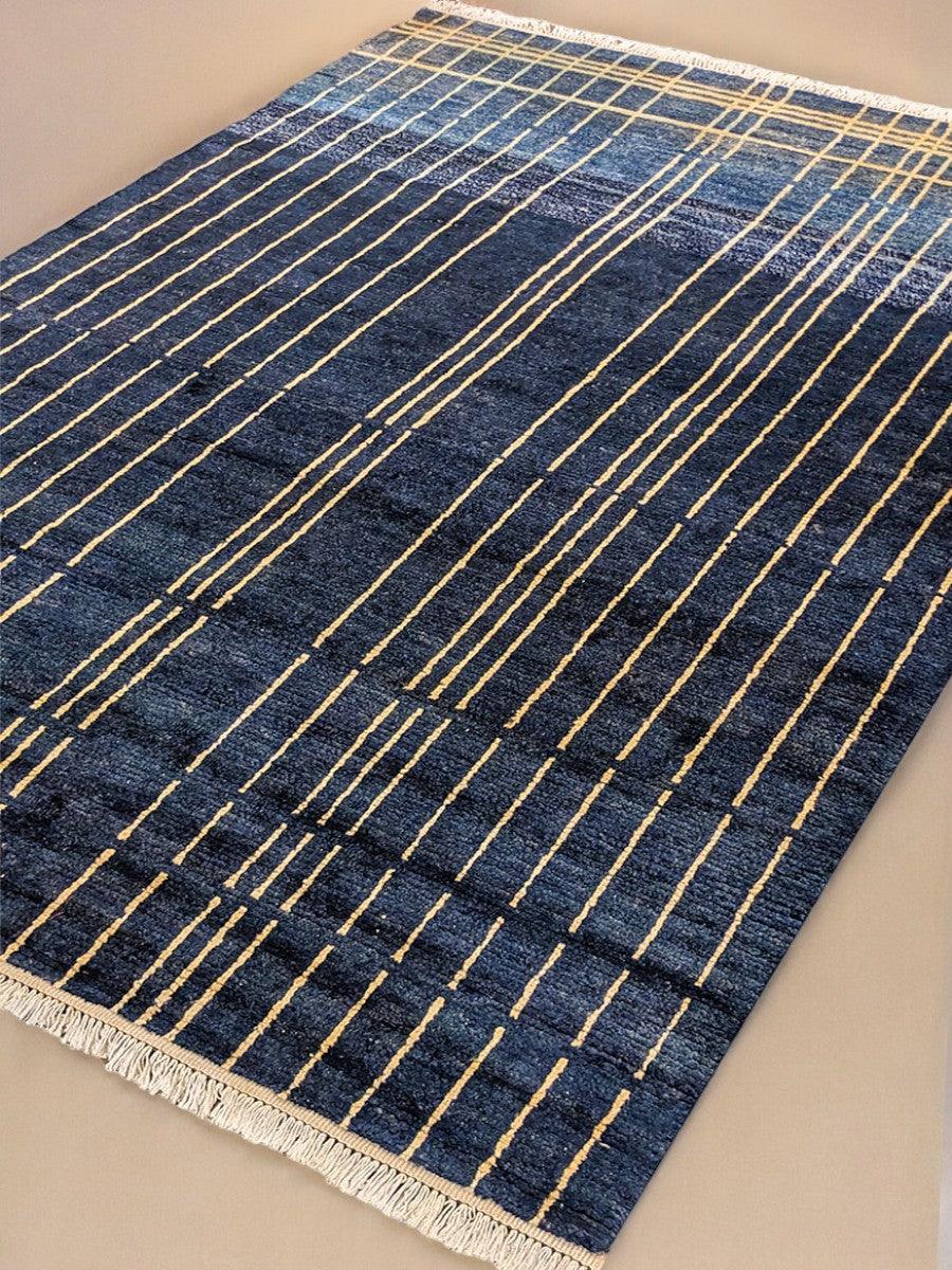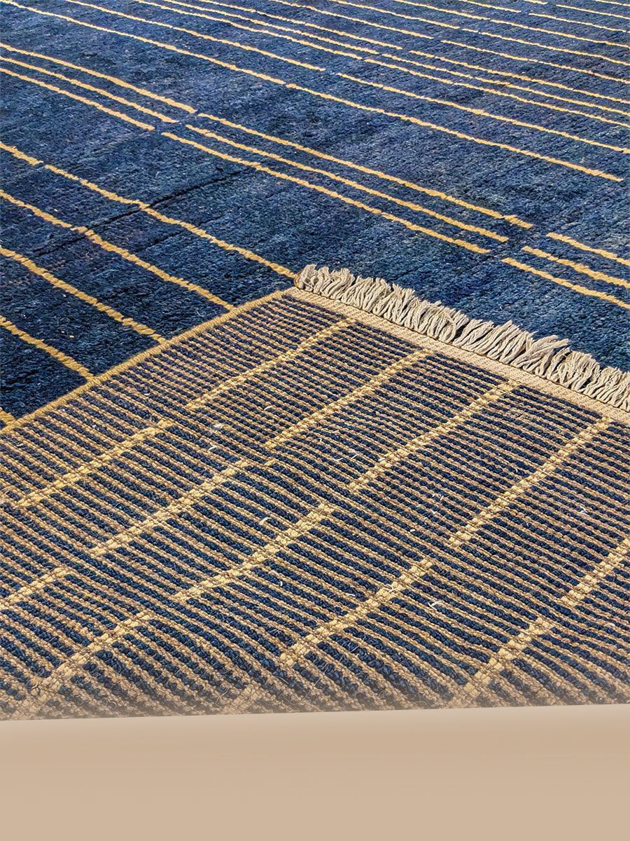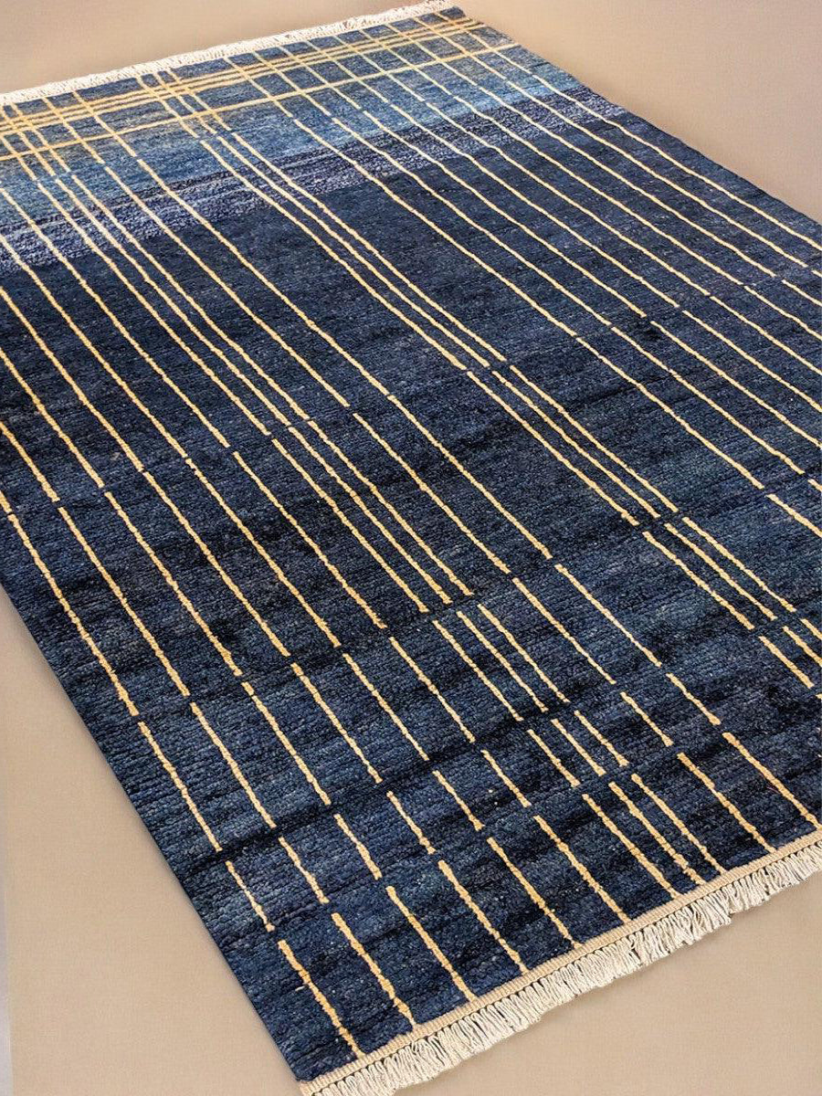 Flourishia Nordic Rug, hand-knotted in golden with dark blue stripes on a serene royal blue background with an abrish effect to create a striking pop of colour. High-quality wool-made, level pile, pixelated texture, and traditional craftsmanship ensure durability and timeless style.