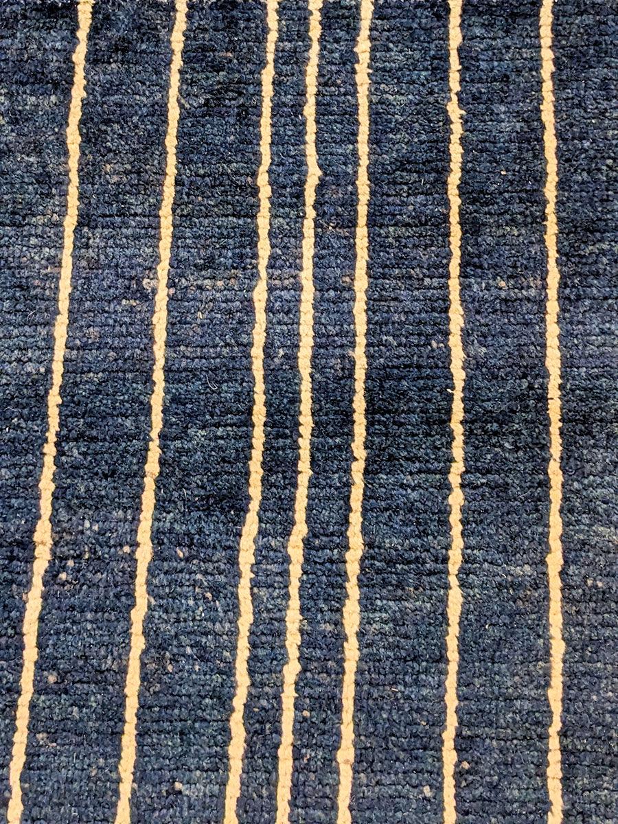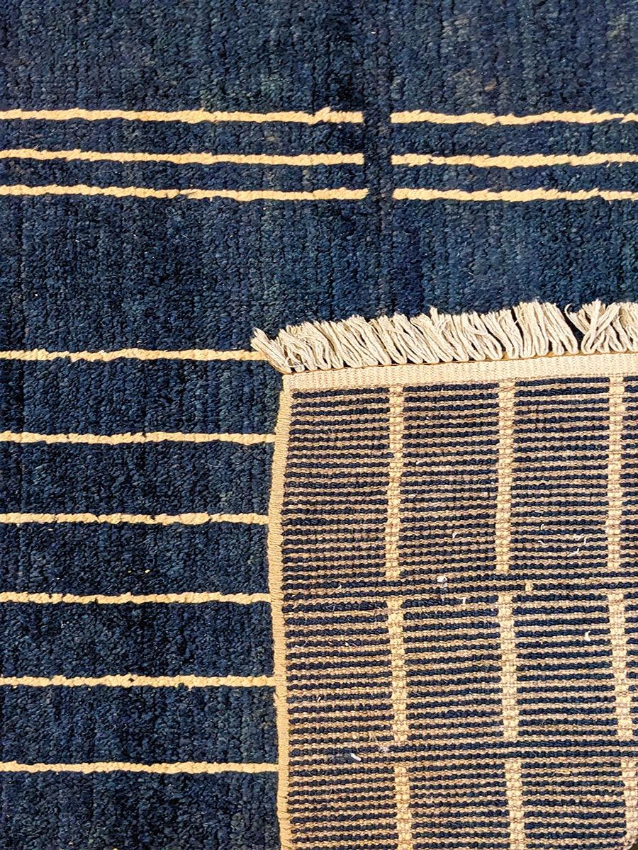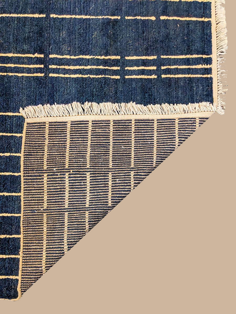 Flourishia Nordic Rug, hand-knotted in golden with dark blue stripes on a serene royal blue background with an abrish effect to create a striking pop of colour. High-quality wool-made, level pile, pixelated texture, and traditional craftsmanship ensure durability and timeless style.