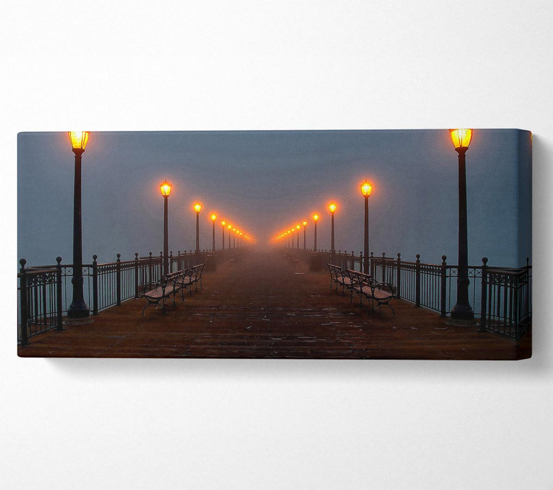Foggy Pier Night Walk canvas, printed on coated polyester canvas. Mounted on to a 44mm box frame, ready to hang.
