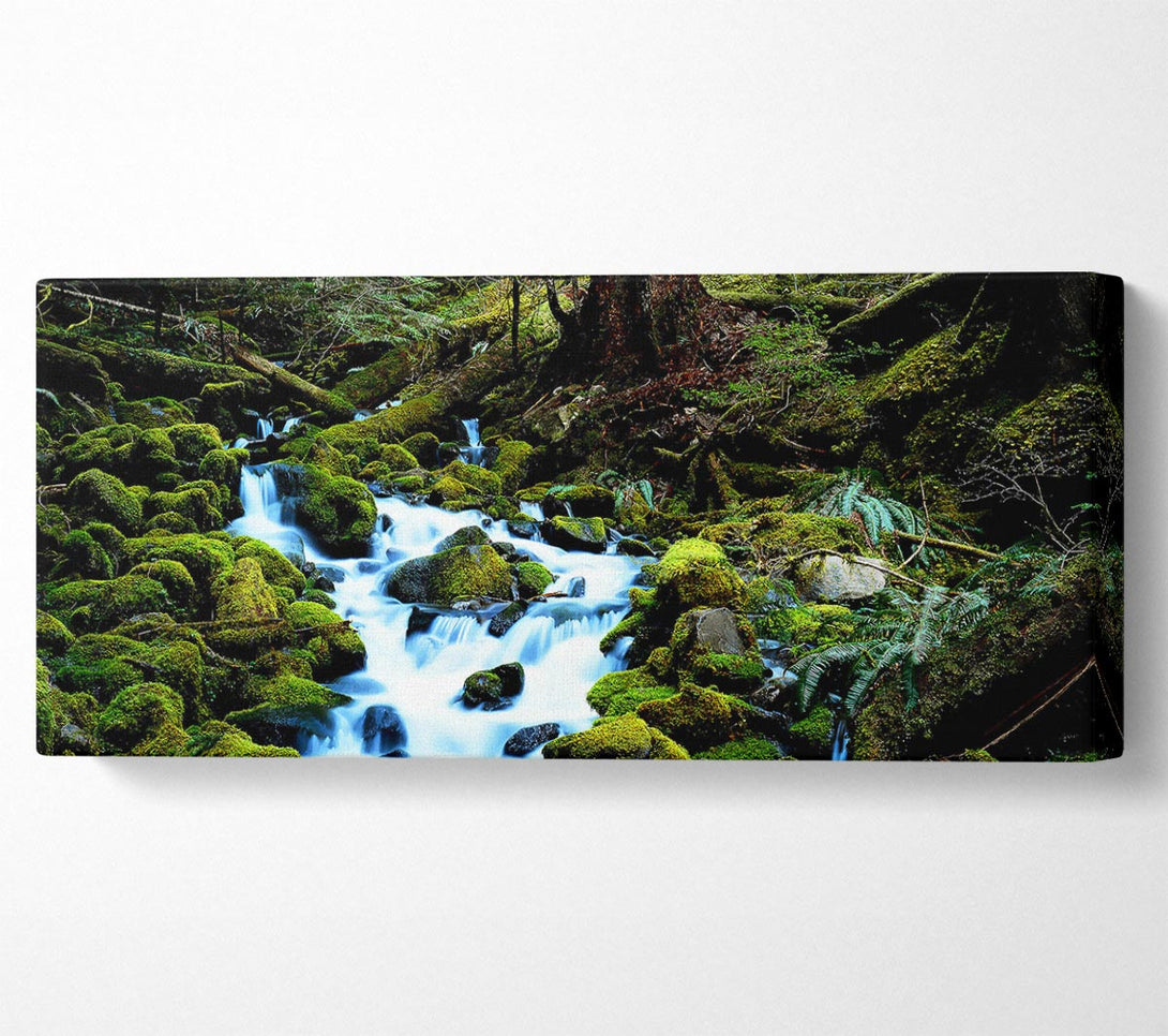 Forest Stream Movement canvas, printed on coated polyester canvas. Mounted on to a 44mm box frame, ready to hang.