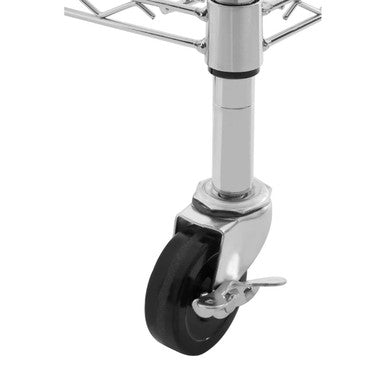 The Frankfurt shelf unit incorporates four storage and display tiers into its structure, with a wireframe construction that gives it an unobtrusive aesthetic. It features lockable caster wheels for easy manoeuvrability.