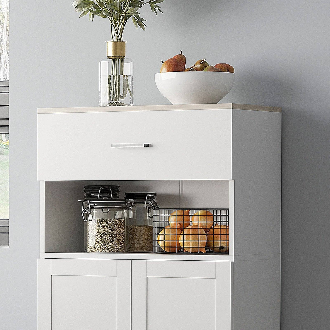 Kitchen running out of space? Then this HOMCOM free standing kitchen unit will get clutter organised in no time. Say hello to its multi-storage design: features a top drawer for utensils and napkins, an open countertop for plates, and a bottom cupboard for pots, dry goods, or plastic containers. Made from particle board frame, this kitchen pantry is sturdy, complete with anti-tipping straps for safety.