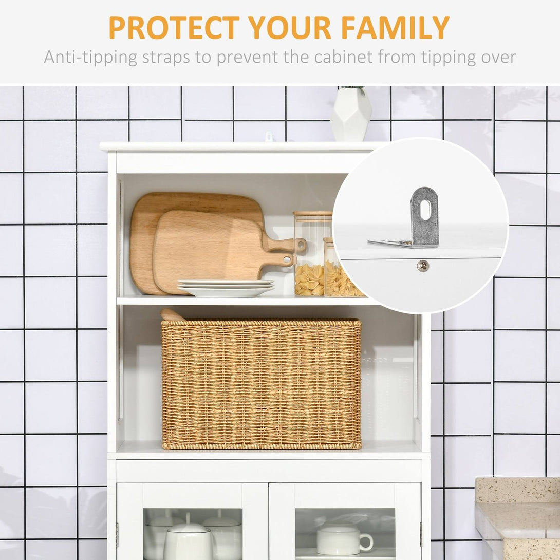 Need some more storage options in the kitchen? This HOMCOM pantry cupboard is here to help. A clean, white design makes this storage unit versatile, with beadboard door panels, glass panels and metal handles for a sleek look. Storage comprised of two shelves, glass door cabinet, and bottom double-door cabinet - plenty of organisation, with mess out of sight.