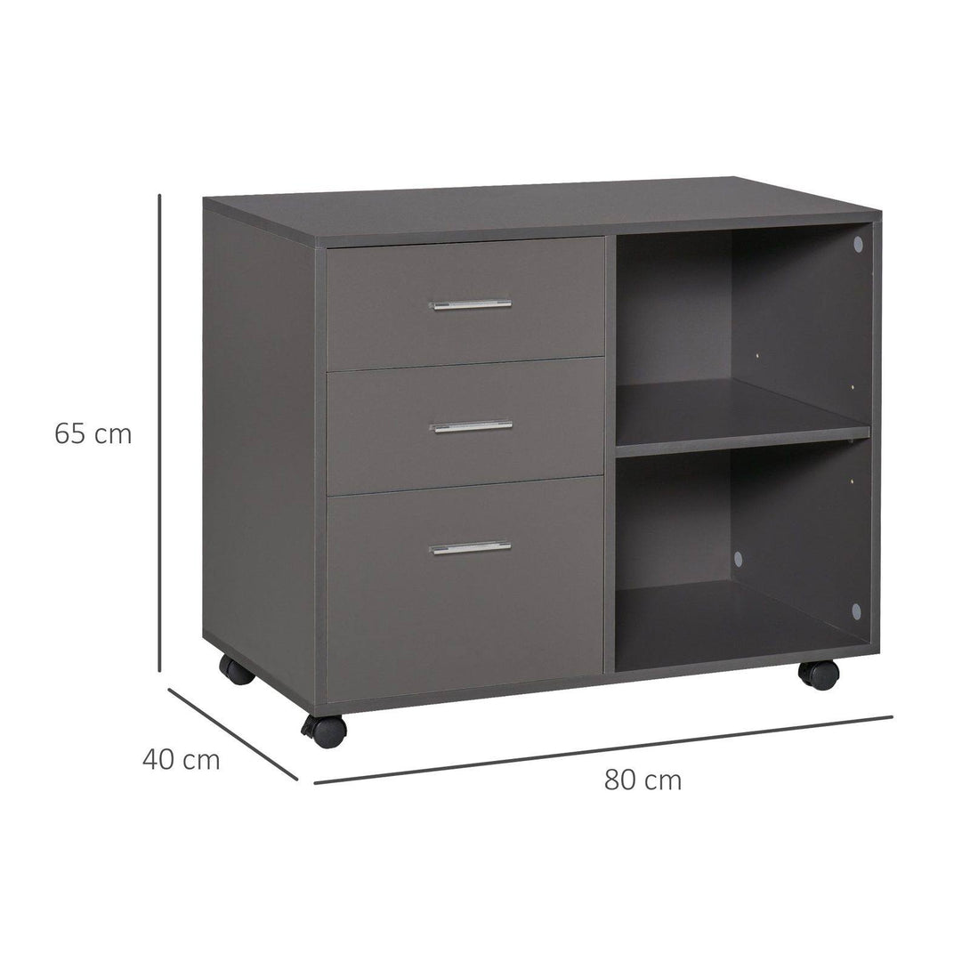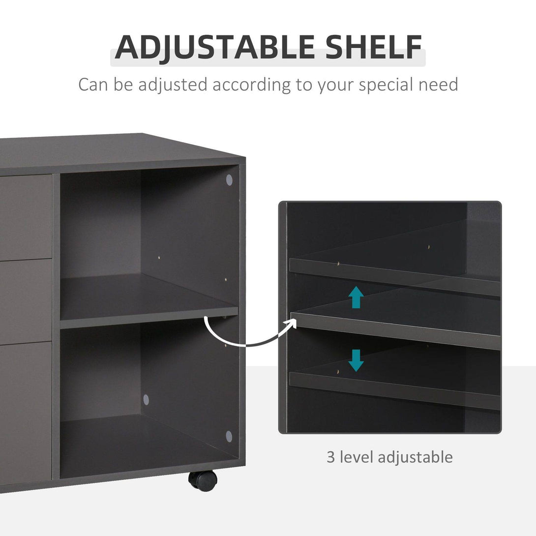Give your office style and storage all at once with this cabinet from HOMCOM. It features two open compartments and three drawers, giving you plenty of space to keep files, folders and stationary organized. The shelf on the right can be adjusted to suit your needs. Four castor wheels ensure easy movement, with two lockable to keep stationary. It's made from particle board, ensuring it is tough and durable for everyday use, in a black colour for a sleek addition which sits well-placed anywhere.