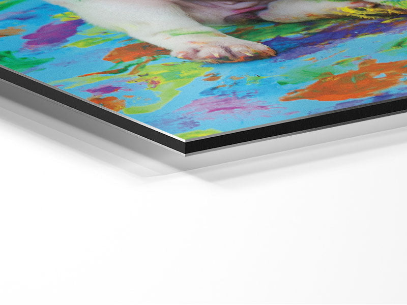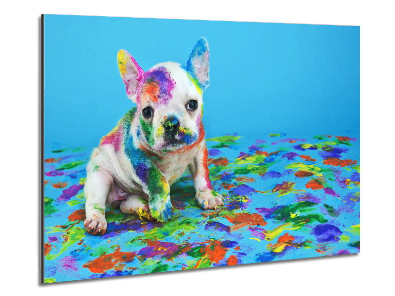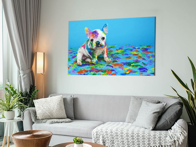 French Bulldog Paint Party Printed on brushed aluminium dibond. A modern way to display art and easy to maintain.