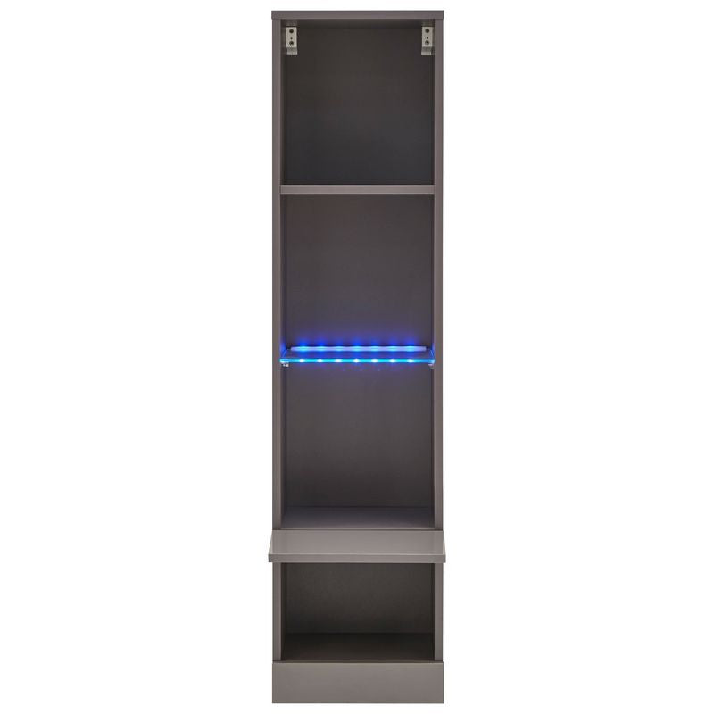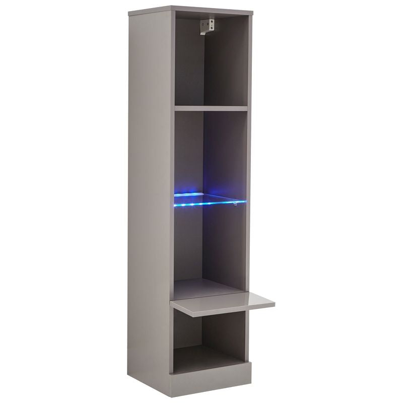 Three open shelves are set above a lower, partially enclosed shelf with a lift-up door all benefiting from a sleek, monochrome finish and high gloss feature front panels. Featuring blue battery-powered LED downlighting for added impact. Part of the Galicia Collection.