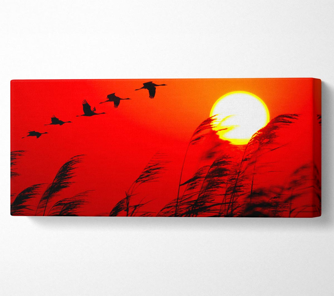 Geese In Flight Under The Red Sun canvas, printed on coated polyester canvas. Mounted on to a 44mm box frame, ready to hang.