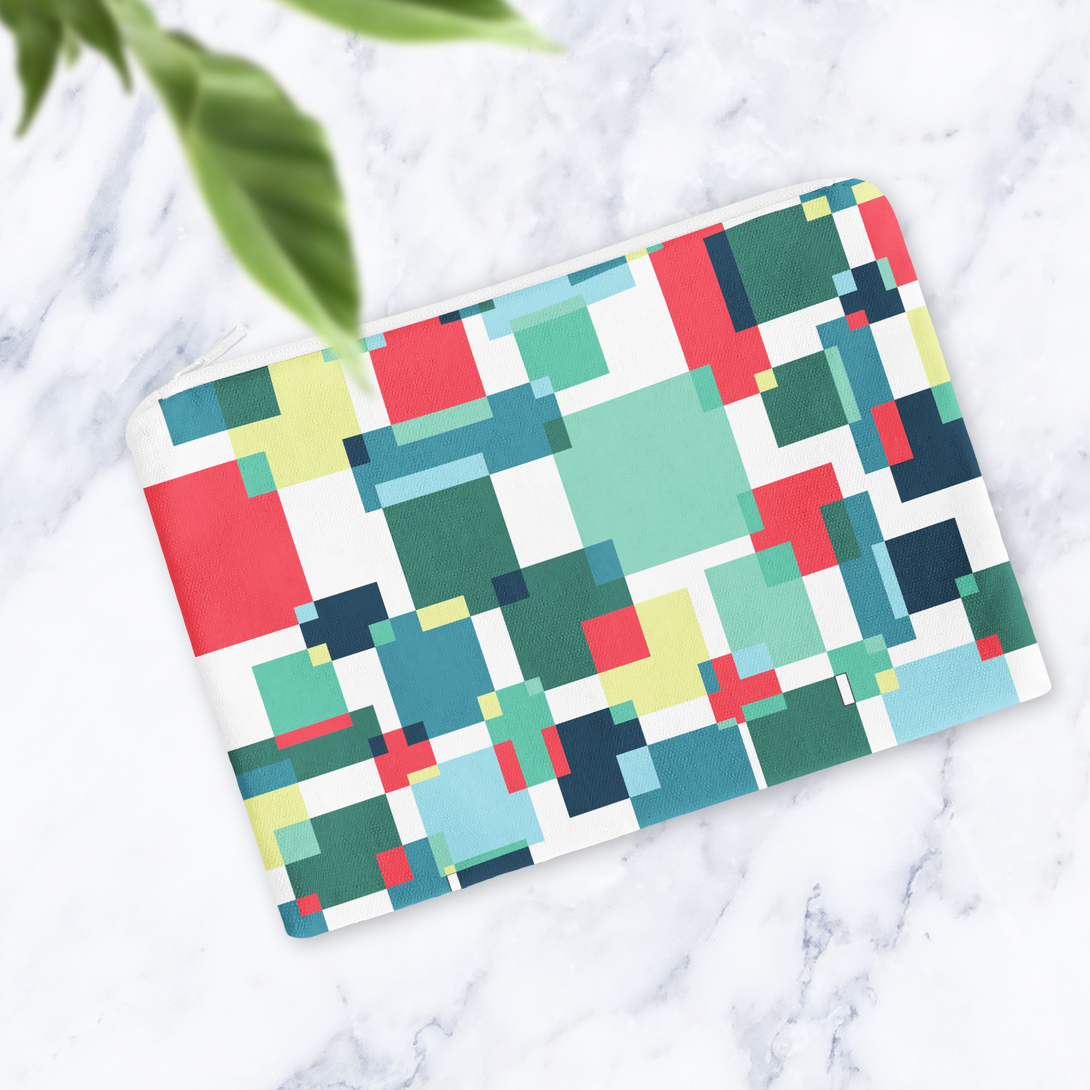 This vibrant geometric cosmetic bag features a modern abstract block pattern in a stunning array of colours including coral, teal, mint green, navy, and yellow on a clean white background. The contemporary design showcases overlapping rectangular shapes that create a sophisticated pixelated effect, perfect for the style-conscious beauty enthusiast.