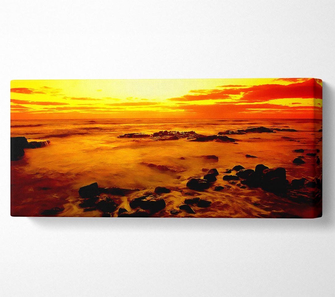 Glowing Ocean Sun canvas, printed on coated polyester canvas. Mounted on to a 44mm box frame, ready to hang.