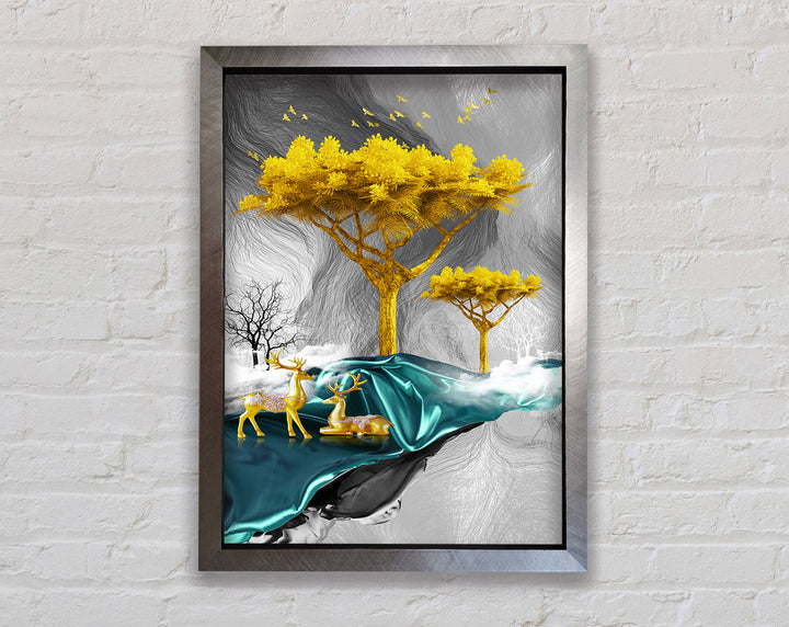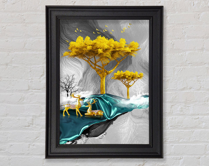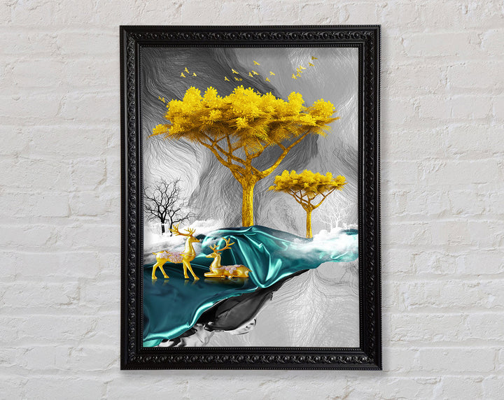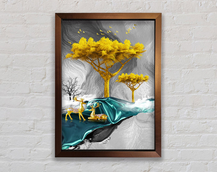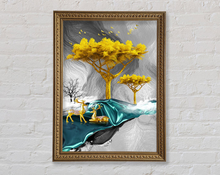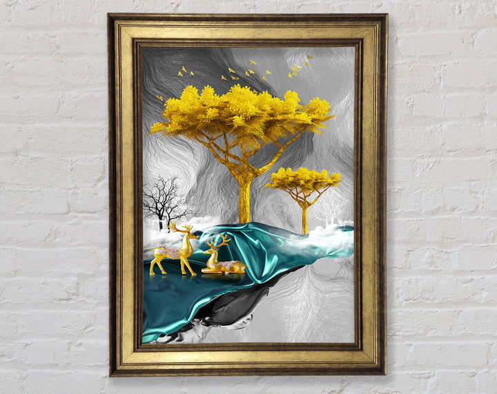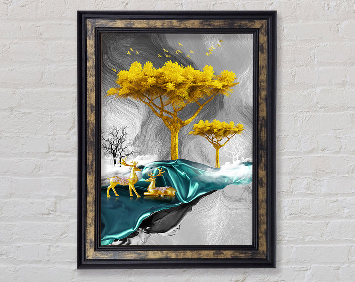 Gold Tree With Two Deers Framed Print