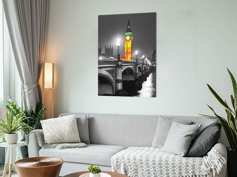 Golden Big Ben Over Tower Bridge Printed on brushed aluminium dibond. A modern way to display art and easy to maintain.