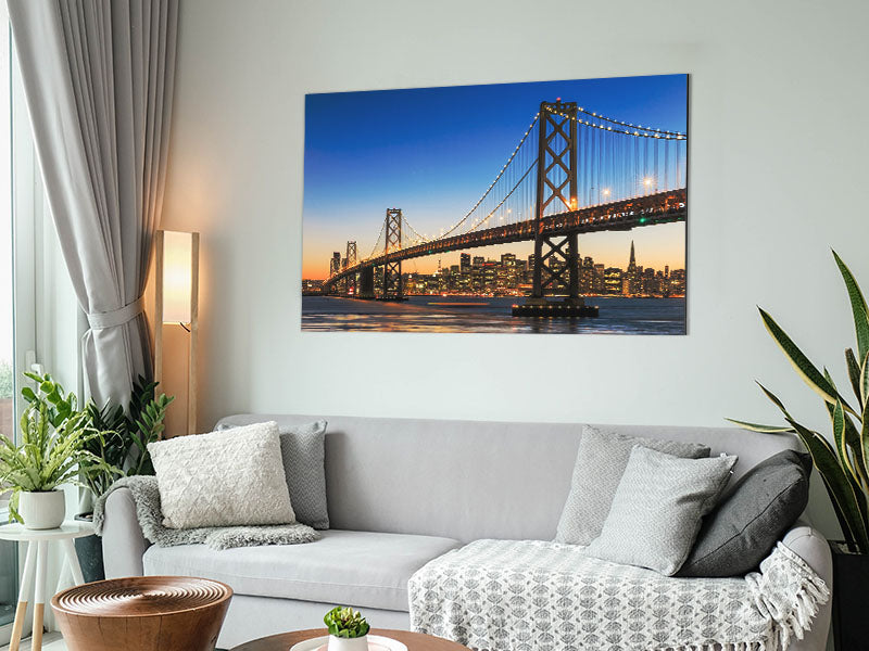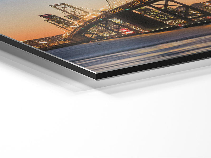 Golden Gate Bridge Lights Of The City Printed on brushed aluminium dibond. A modern way to display art and easy to maintain.