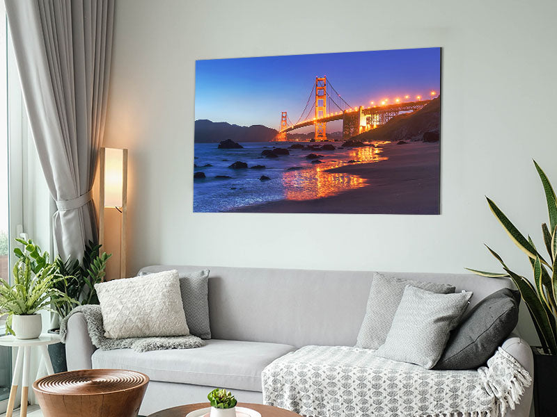 Golden Gate Bridge Stunning Light Glow Printed on brushed aluminium dibond. A modern way to display art and easy to maintain.