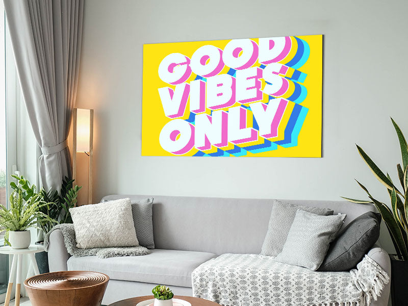 Good Vibes Only Bold Printed on brushed aluminium dibond. A modern way to display art and easy to maintain.