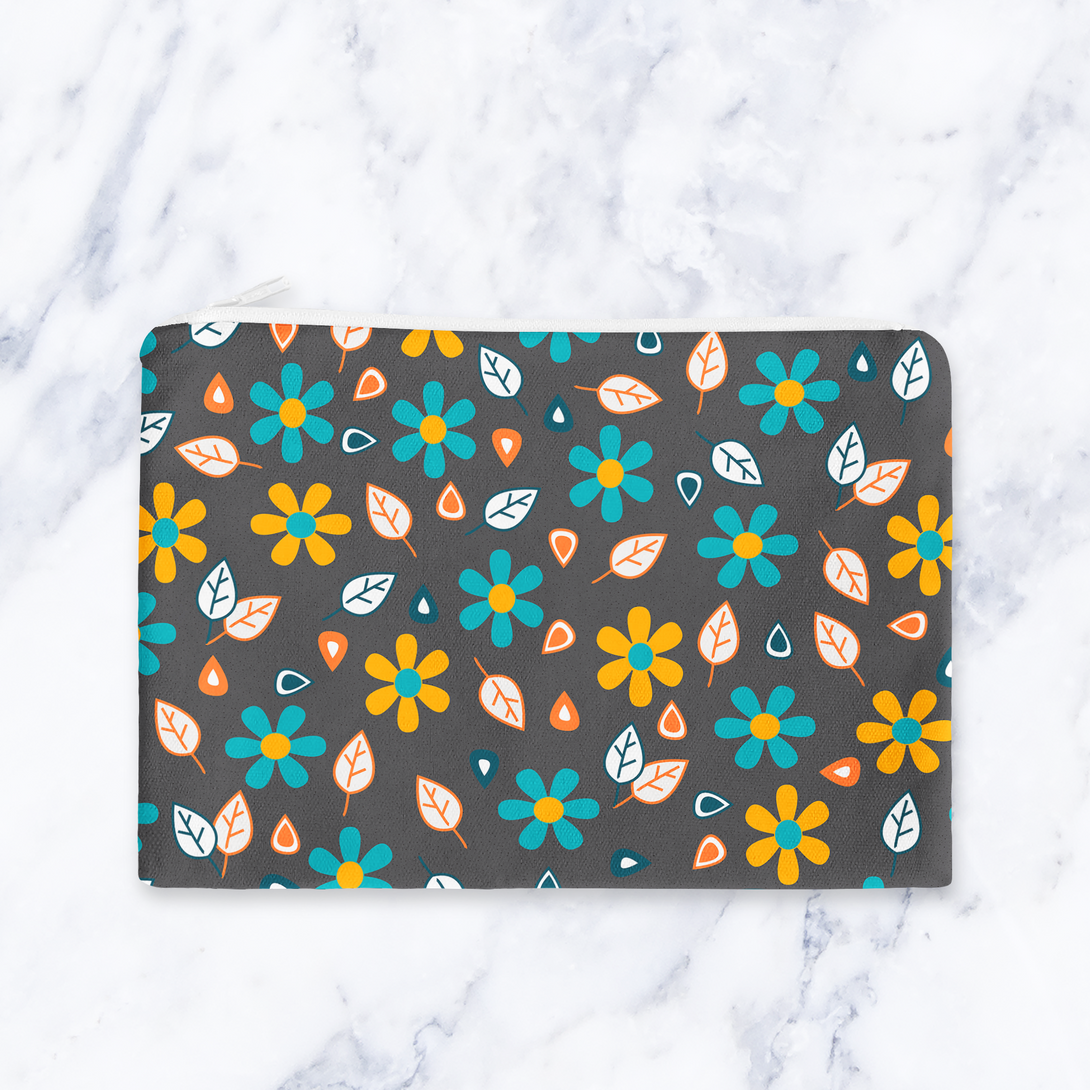 This dark grey floral cosmetic bag features a modern flower pattern in a stunning array of bright colours including blue and orange .