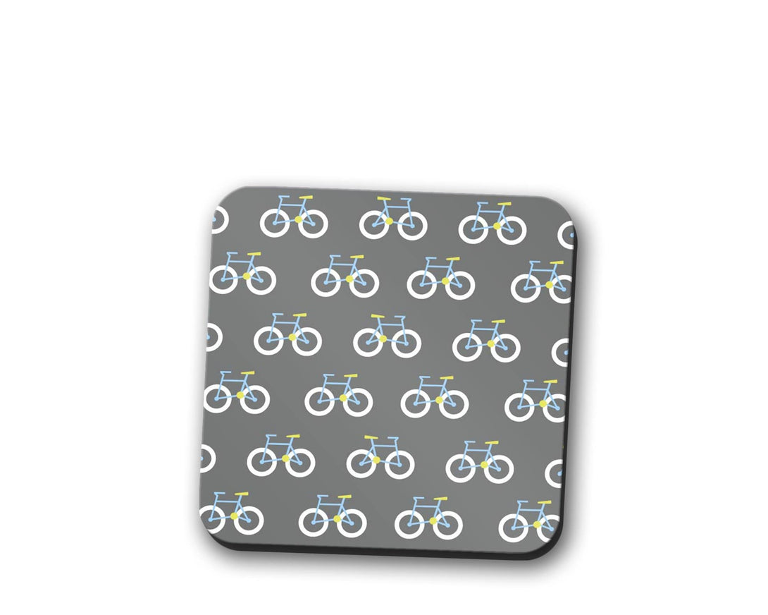 This grey bicycle coaster collection is available either as a single coasters or as a set of 4. The coasters feature a grey, yellow and blue bicycle design. This pattern is inspired by a love of reading with my children and is drawn using Shadowbright's clean and simple style. This coaster is part of my bicycle collection.