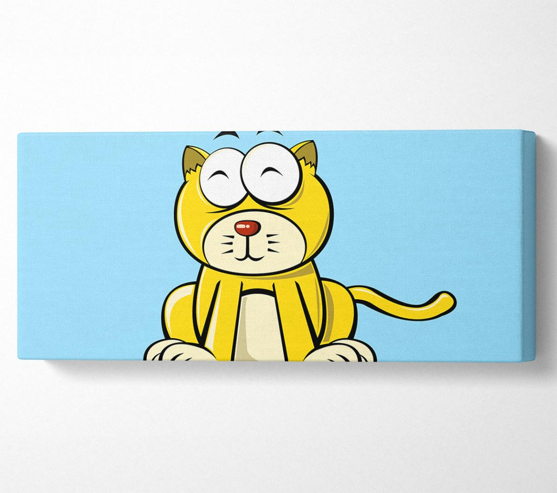 Happy Cat Sitting Baby Blue canvas, printed on coated polyester canvas. Mounted on to a 44mm box frame, ready to hang.