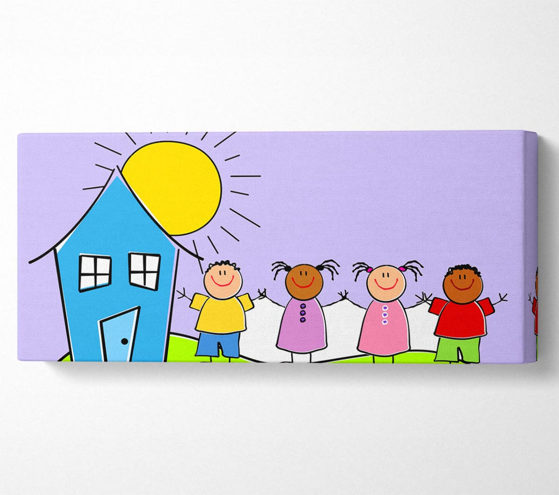 Happy Children In The Sun Lilac canvas, printed on coated polyester canvas. Mounted on to a 44mm box frame, ready to hang.
