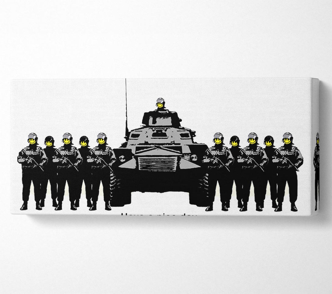 Have A Nice Day White canvas, printed on coated polyester canvas. Mounted on to a 44mm box frame, ready to hang.