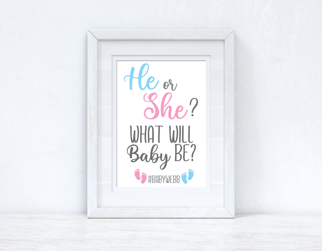 He Or She? What Will Baby Be? Custom #Last Name Baby Announcement Unisex Simple Room Wall Decor Print