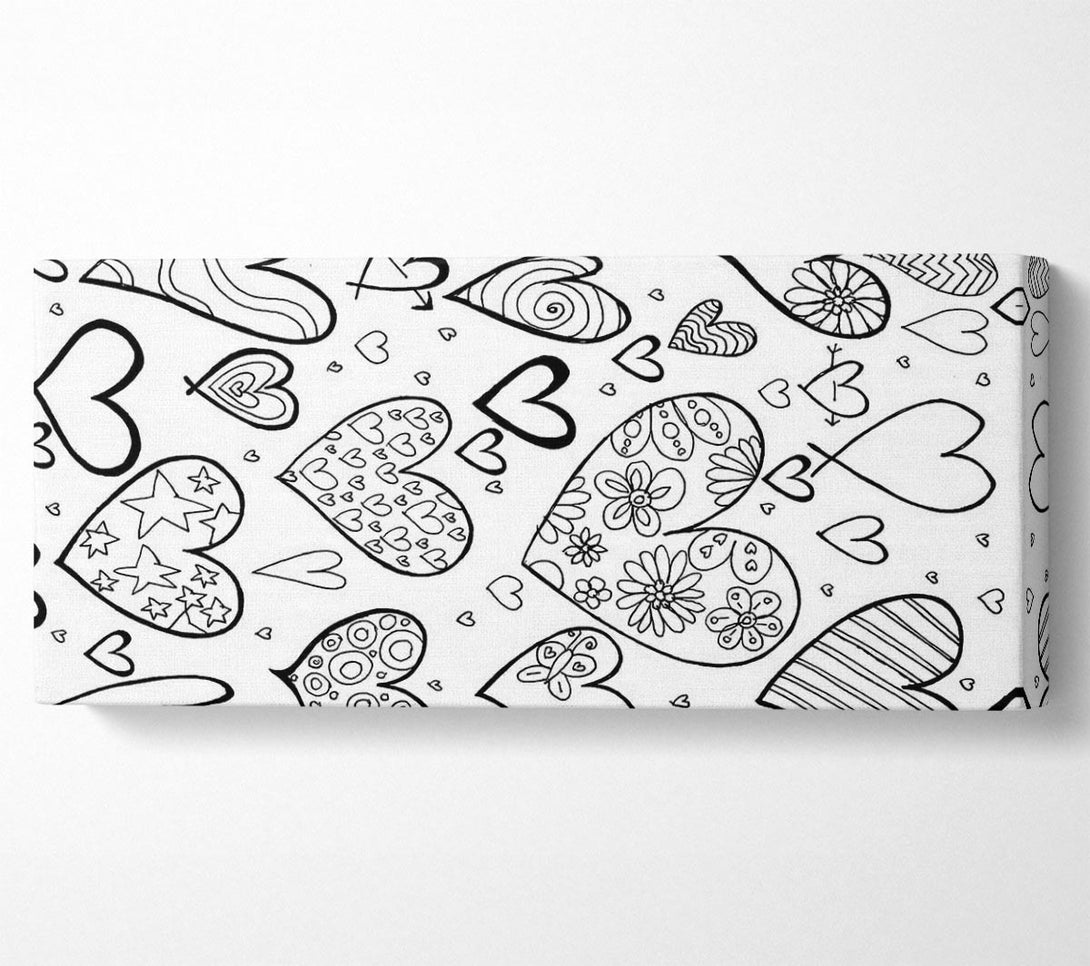 Hearts Black On White canvas, printed on coated polyester canvas. Mounted on to a 44mm box frame, ready to hang.