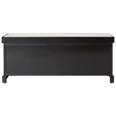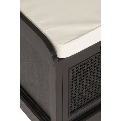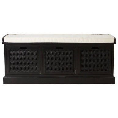 This wooden storage bench has three spacious drawers with cutout handles and intricate cane webbing detail. With its timeless aesthetic in an antique black finish, this bench will bring sophistication to any space.