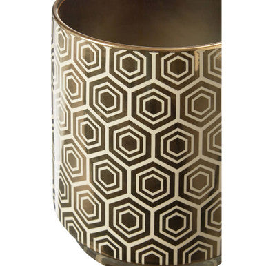This drum-shaped planter is made from ceramic and exhibits a rich gold finish surface. An array of cream-toned symmetric hexagonal patterns work wonderfully with geometric aesthetics, and the glazed finish of this planter gives it a reflective appeal.
