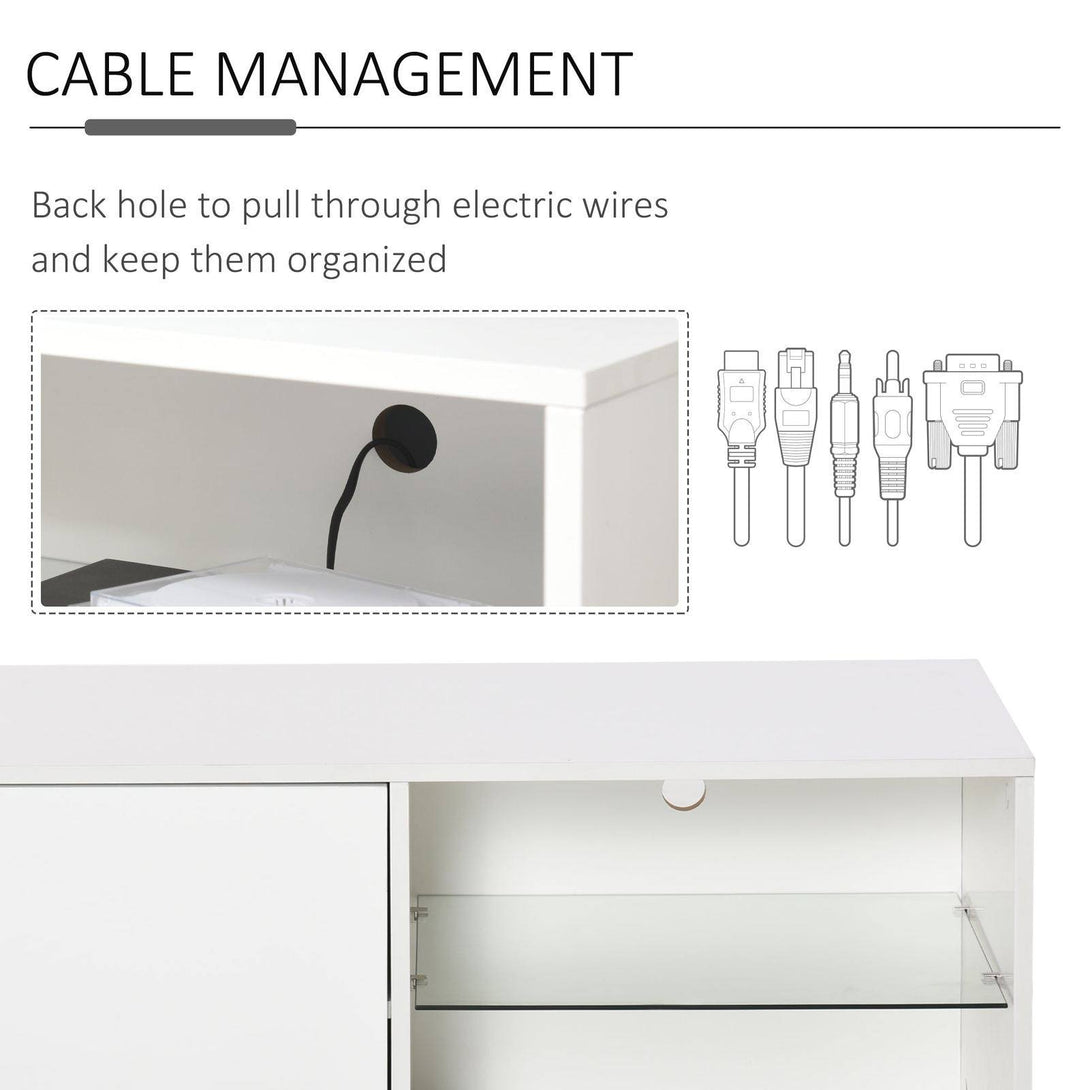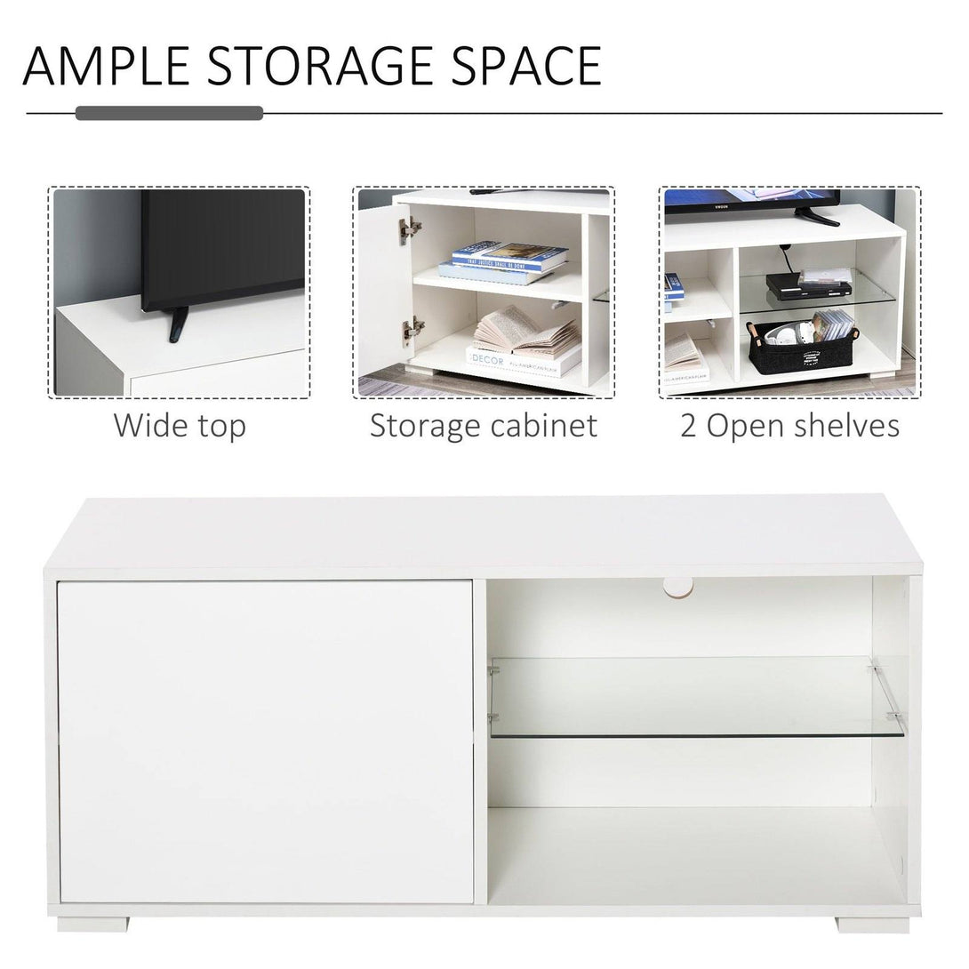 The clean design of this HOMCOM TV stand makes it an all-round winner for every home. Fresh white in finish, it's crafted into a boxy rectangular shape, meaning it can effortlessly pair with other furniture. It features a cabinet on the left for off-display storage, with two open glass shelves on the right which is a must for any media devices and consoles. There is a cut-out hole on the back to feed wires through, and the flat table top offers extra holding room. The durable particle board frame is completed with small corner feet for stability.