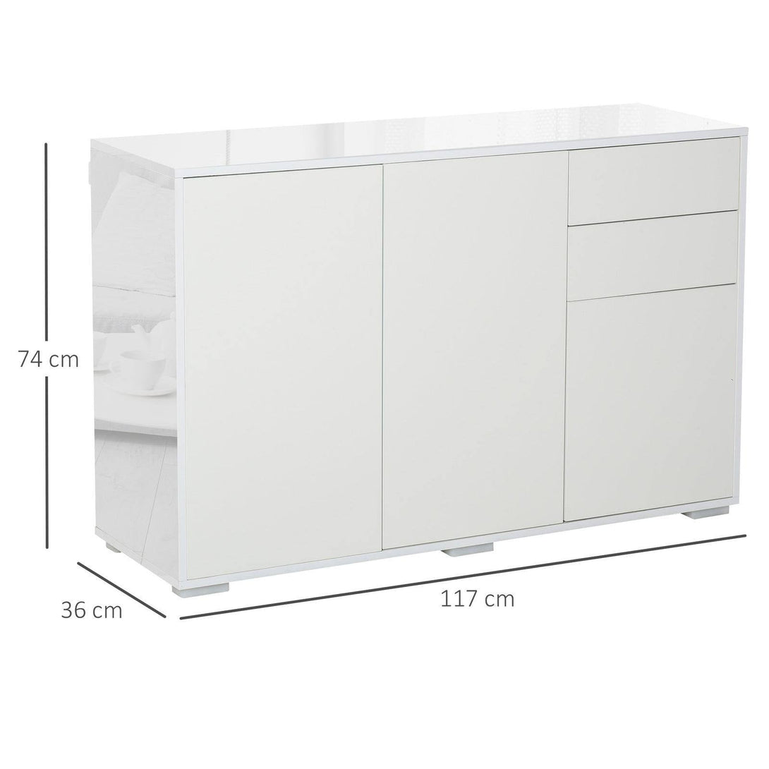 This HOMCOM large and oblong cabinet is a durable and stylish addition to every home, keeping your space clean and tidy with ease. It's made from MDF for a durable structure, with anti-tipping straps on the back for safety. The practical design, with the push-click drawers and cabinet doors makes them quick and effortless to open and close. The elevated base allows air to flow through for freshness. An effortless way to bring in sleek style into your living space.