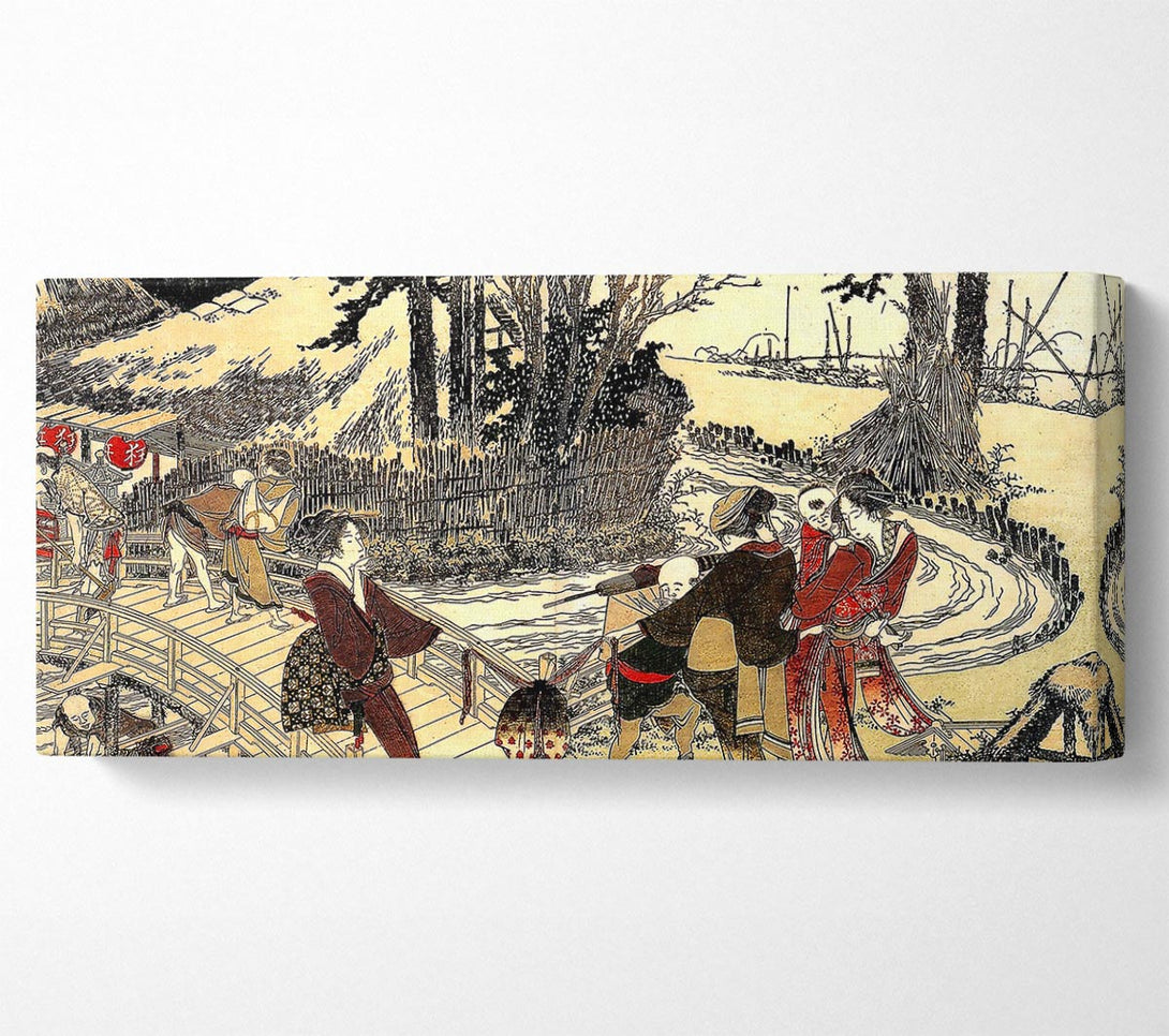 Hokusai Village Near A Bridge canvas, printed on coated polyester canvas. Mounted on to a 44mm box frame, ready to hang.