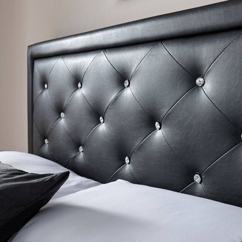 A bed designed to take centre stage in the most opulent of bedrooms, Hollywood brings a touch of silver-screen glamour to any home. The sumptuously padded boxed base is covered with a sumptuous black faux leather adorned with sparkling diamantes. The head and base boards both feature a framed and deep-buttoned panel for comfort and style. But Hollywood also conceals a secret: under the sprung mattress platform is a spacious repository for spare bedding and accessories. Its the perfect spot for extra quilts, blankets, throws and cushions, freeing up the rest of your storage space and making good use of an otherwise underused area. Part of the Hollywood Collection.
