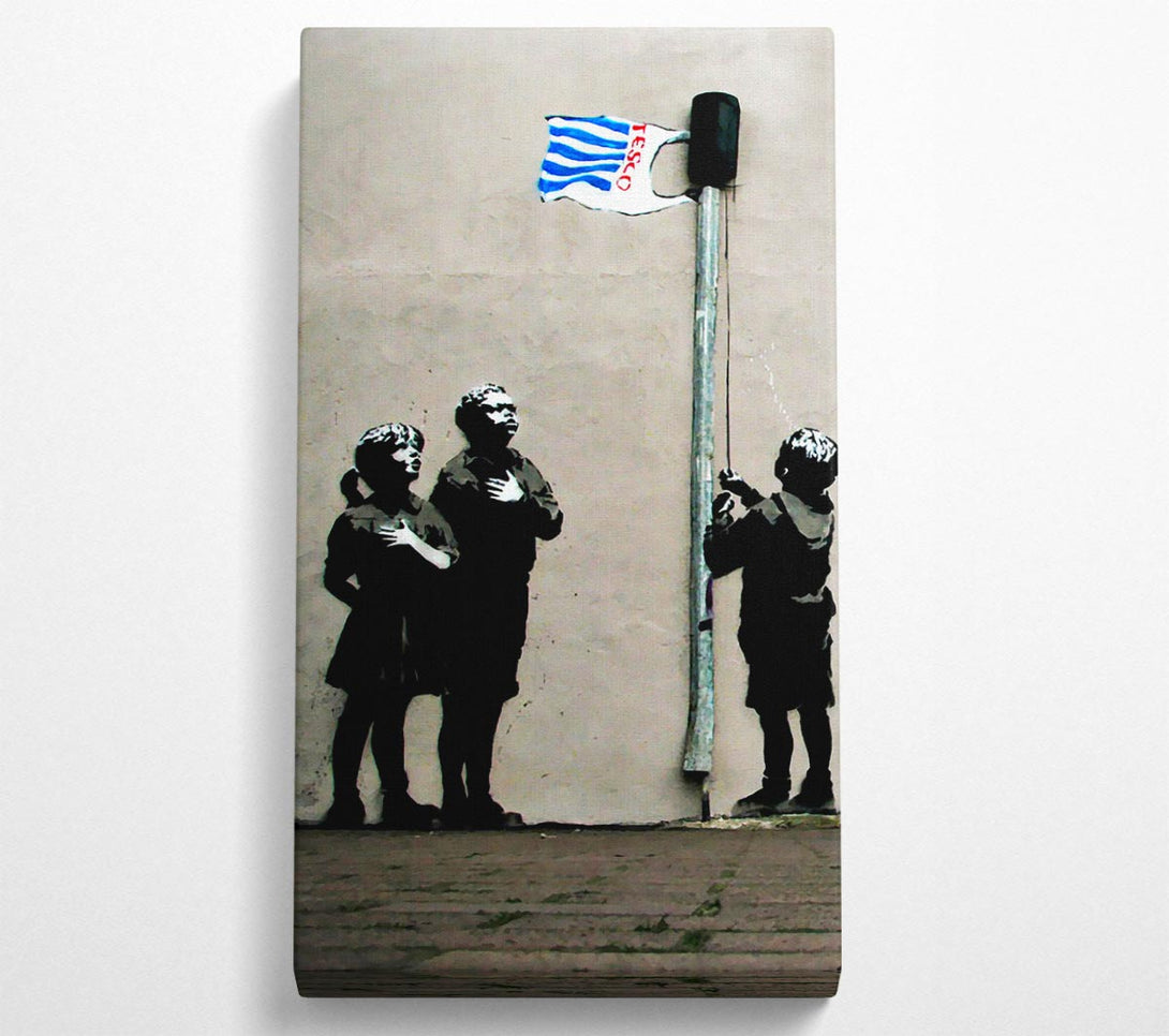 Homage To The Tesco Flag canvas, printed on coated polyester canvas. Mounted on to a 44mm box frame, ready to hang.