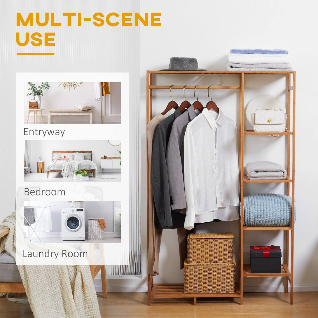 Homcom Bamboo Clothes Rack for Bedroom Garment Rack with 6-Tier Storage Shelf Hanging Rod Clothes Rail for Living Room Entryway