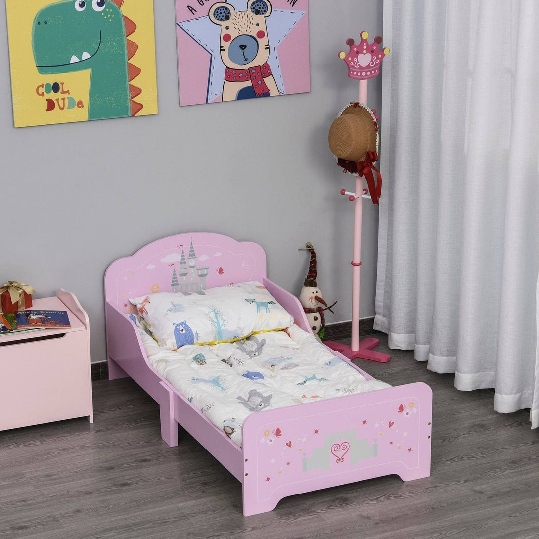 Make them King or Queen of their own bedroom with this children's bed from HOMCOM. The low-rise design allows them to get in and out easily and safely. Made from poplar wood and MDF, the frame is solid tough, fully supporting their body weight as they sleep. Non-toxic to protect your child's health, the frame is painted with a cute Princess castle, flower and butterfly design in pink. It comes with slats to support the mattress. The most magical way for them to drift themselves to sleep. Recommended for ages 3-6 years.