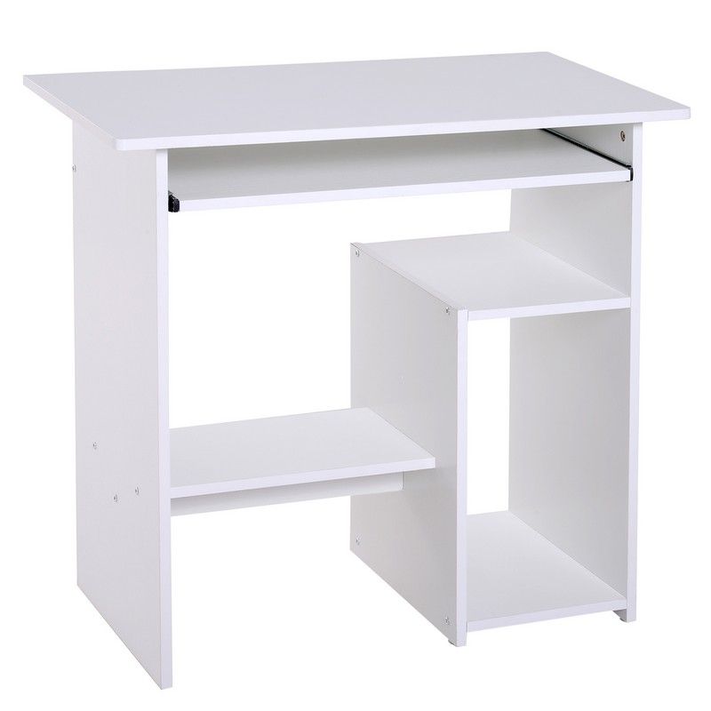 This compact computer desk is a simple but extremely useful addition for the home desk is spacious enough to carry work out peacefully. Made from thick particle board in a fresh finish, this sturdy and durable piece is crafted into a design which features a slide-out keyboard tray, CPU stand, two open storage shelves and a large worktop. Smooth on top, the non-scratch melamine surface is easy to clean and maintain, making it perfect for busy lifestyles.