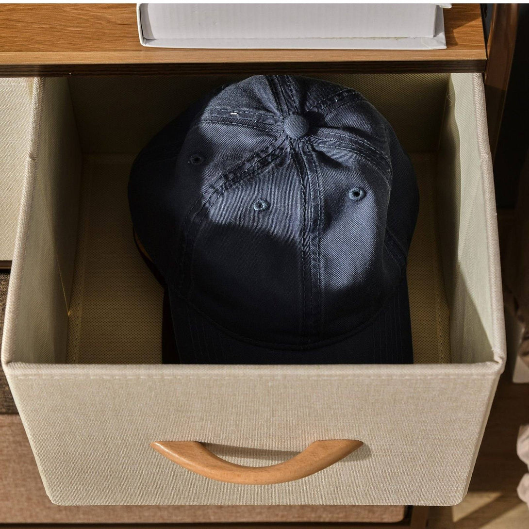 - Linen-feel drawers can be removed and folded. Comes with handle to open and close