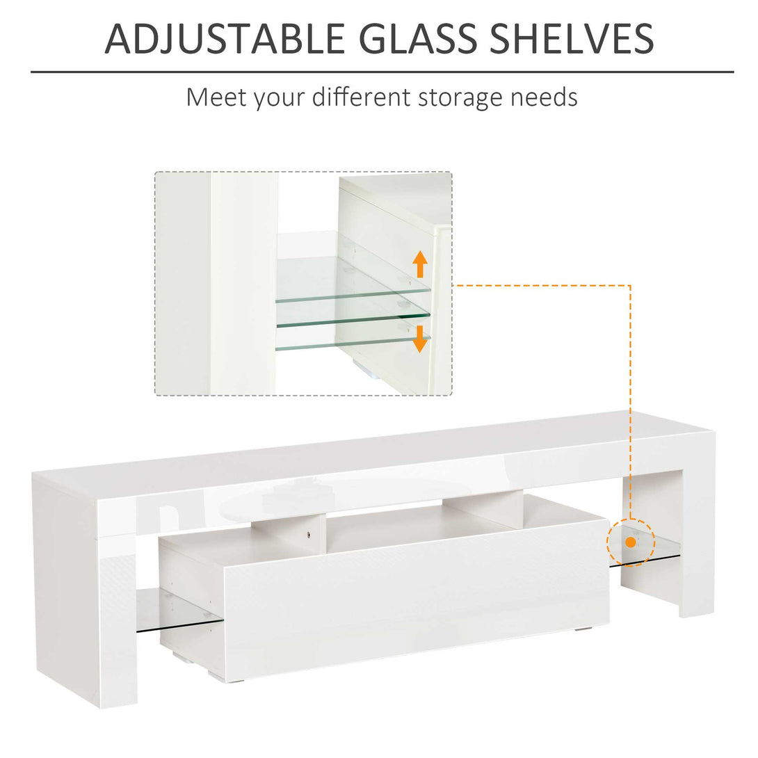 Take HOMCOM TV stand to make your home fashionable! This TV cabinet is stylish and sturdy, with clean lines and high glossy color that complete the look and decorate any home style. 16 colors light with 4 lighting modes add more exciting elements to your life. Multiple storage compartments make your home more cleaner. It’s totally a perfect gathering piece and anchor for your living space!