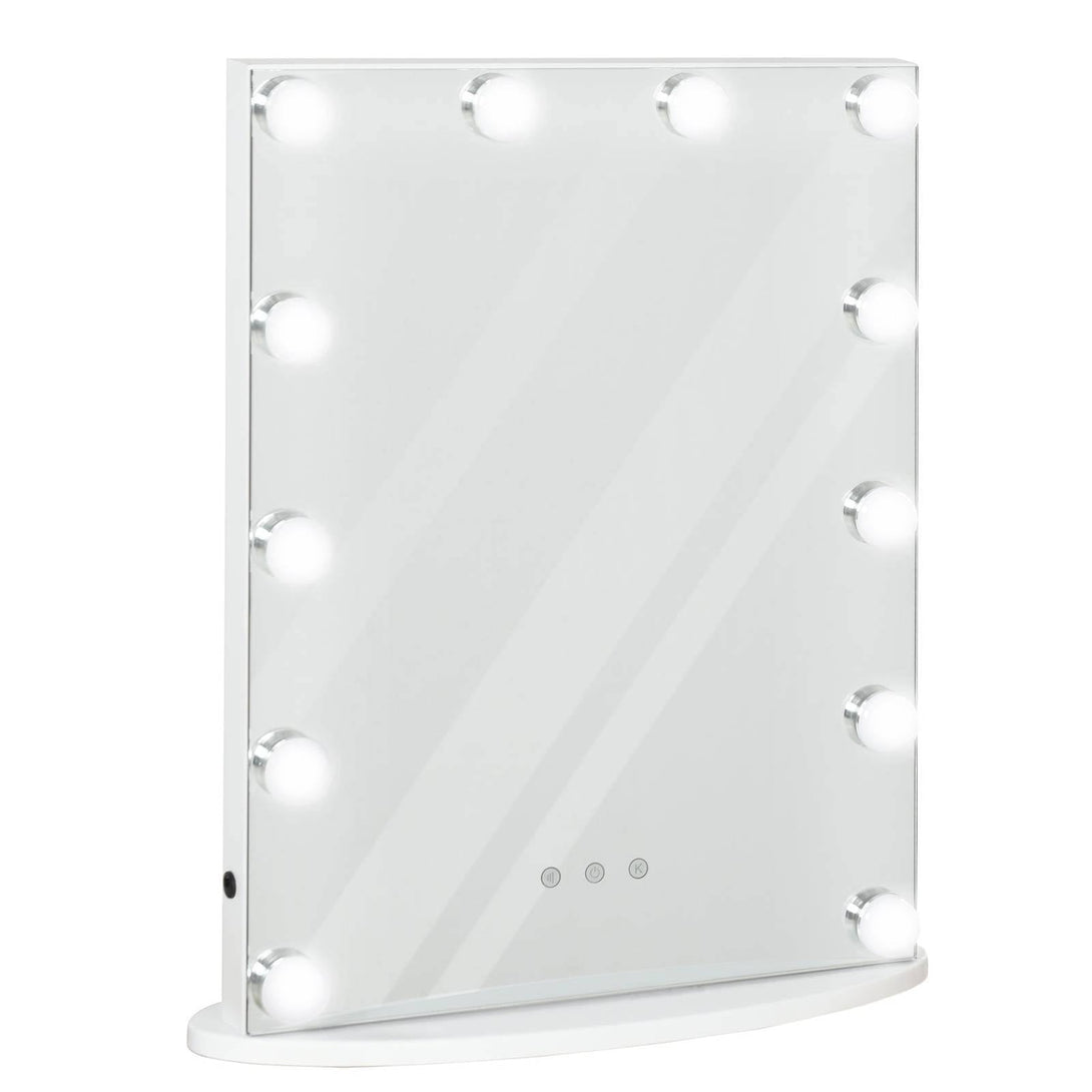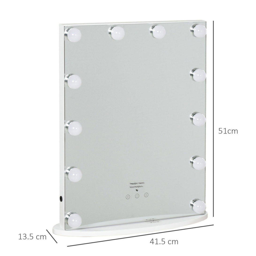 Be the star of your everyday life with this glamorous Hollywood mirror from HOMCOM. This classic design is a must for every bedroom and dressing space - with its large and clear mirror, surrounded by 12 LED bulbs for the perfect amount of illumination to get ready easily with plenty of light. Each bulb is dimmable and can be set to three different shades - warm white, white and cold white - perfect for day and night use. It's fitted on a base to keep it steady, and is finished with a small middle button for easy operation. Please note, this mirror is powered by USB plug which is included.