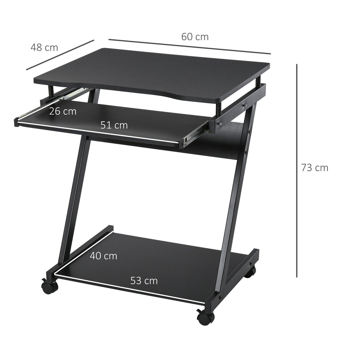 Keep your working times clean and clutter-free with this small desk for home office from HOMCOM. The frame is made of metal for a sturdy structure, crafted into a 'z' shape design which enables it to keep balanced and stable. It features an open tabletop, slide-out keyboard tray and bottom shelf, giving you plenty of room for working and storage. 4 locking wheels at the bottom, making this pc desk easy to move around and keep stationary. A modern piece perfect for all home and office spaces.