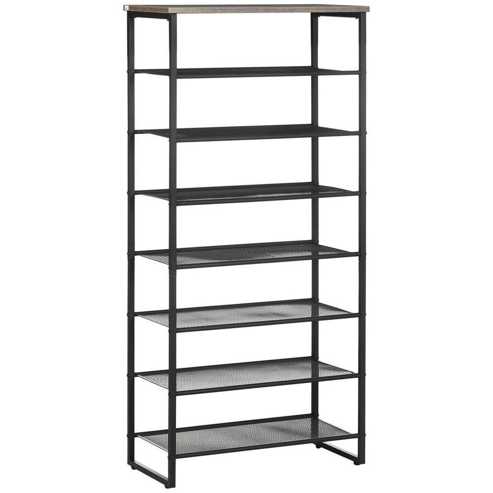 Seven-shelf design: Shoe rack has plenty of room for the whole family. Each shelf of this shoe stand holds up to three pairs.Metal shoe rack structure: Steel frame makes this a hallway storage unit which supports shoes and boots in place.Mesh shelves: Air circulates better around this narrow shoe rack, keeping items fresh.Tall shoe rack design: Doesn't take up too much space, making it suitable for smaller places in the hallway, living room, bedroom and closets.Dimensions: 126H x 60W x 28.5Dcm. Maximum load 40kg. Easy to assemble.