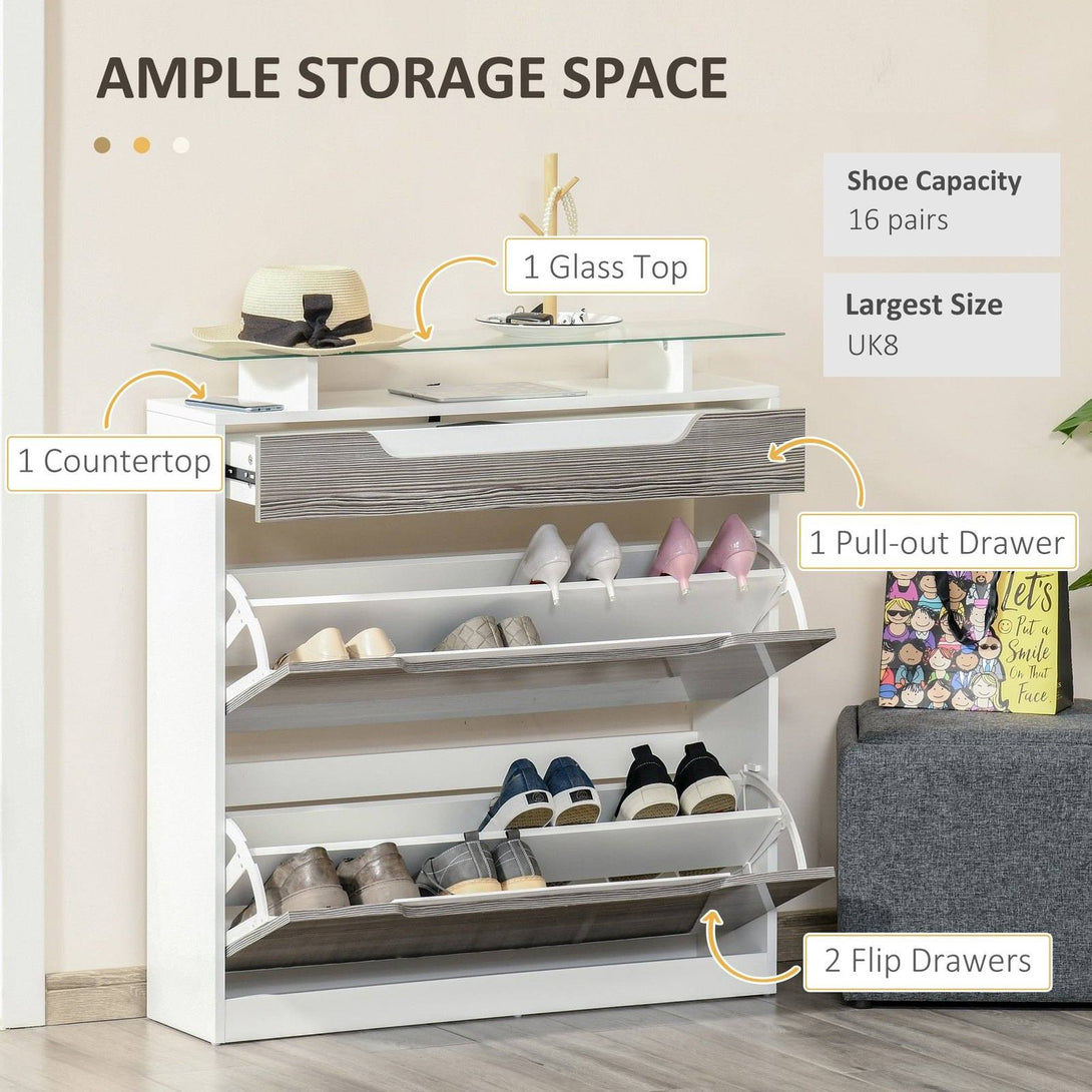 Give shoes and more somewhere stylish and protective to keep them - grab this narrow shoe cabinet from HOMCOM. There are two flip drawers, each can hold eight pairs - perfect for use with the family or your flatmates. The inner shelf can be set to two different positions for storage which fits your shoes better. This tall shoe cabinet is made from a blend of MDF and particle board, so its durable. Finished with a handy top drawer and glass shelf, offering even more storage and display space.
